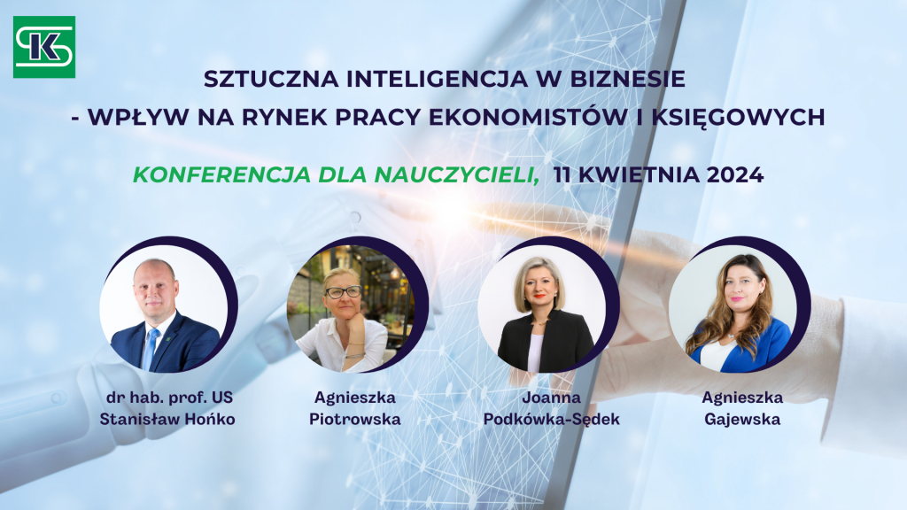 Nauczycieli przedmiotów zawodowych w obrębie zawodów technik ekonomista, technik rachunkowości oraz powiązanych przedmiotów zawodowych zapraszamy 11 kwietnia 2024 roku na konferencję online „Sztuczna inteligencja w biznesie – wpływ na rynek pracy ekonomistów i księgowych”.