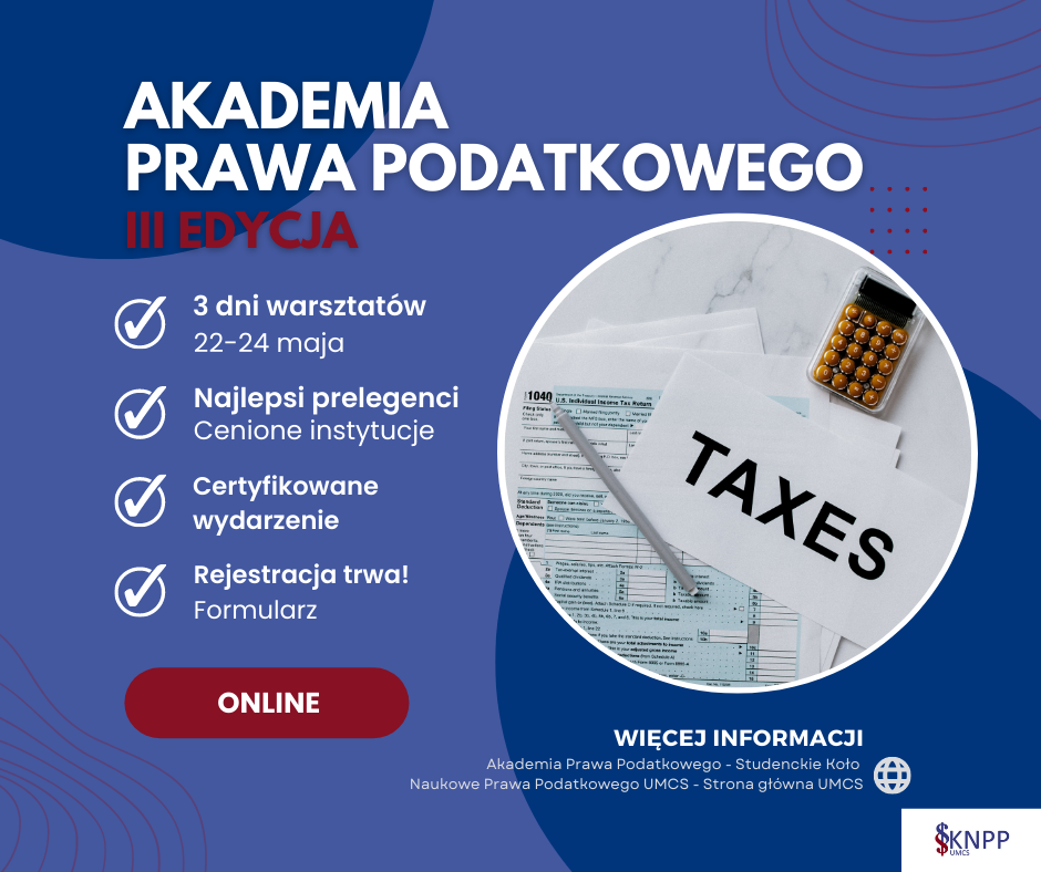Akademia Prawa Podatkowego jest to cykl spotkań o tematyce prawno-podatkowej. Celem wydarzenia jest rozpowszechnienie prawa podatkowego jako dziedziny wartej zainteresowania, poszerzenie wiedzy w zakresie podatków oraz postępowania podatkowego, a także stworzenie pola do dyskusji z praktykami na nurtujące tematy. Akademia prawa Podatkowego przyjmuje postać warsztatów online, których tematyka obejmuje szeroko pojęte kwestie podatkowe. Praktyczne ujęcie teoretycznych problemów pozwala zrozumieć istotę instytucji prawnych i jest przyczyną refleksji naukowej. Akademia Prawa Podatkowego kierowana jest do studentów oraz praktyków prawa z całej Polski.