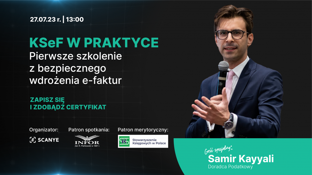 Już 27.07.2023 r. zapraszamy na pierwsze darmowe szkolenie z bezpiecznego wdrożenia KSeF. O tym jak w bezpieczny i łatwy sposób przygotować się na wejście e-faktur i już teraz uprzedzić konkurencję, opowie Samir Kayyali, doświadczony doradca podatkowy.