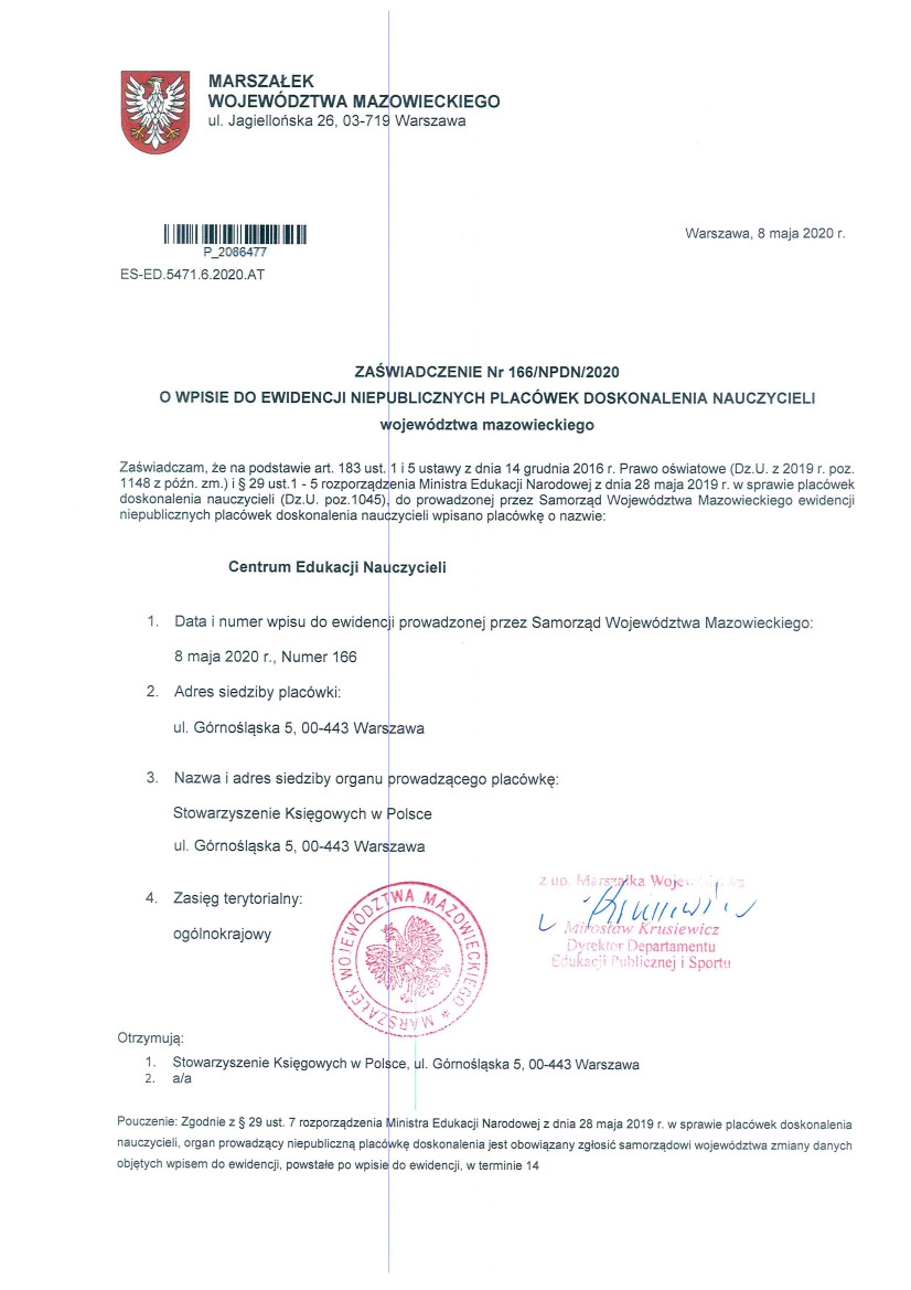 Centrum Edukacji Nauczycieli uzyskało wpis nr 166/NPDN/2020 do ewidencji niepublicznych placówek doskonalenia nauczycieli, prowadzonej przez Samorząd Województwa Mazowieckiego.