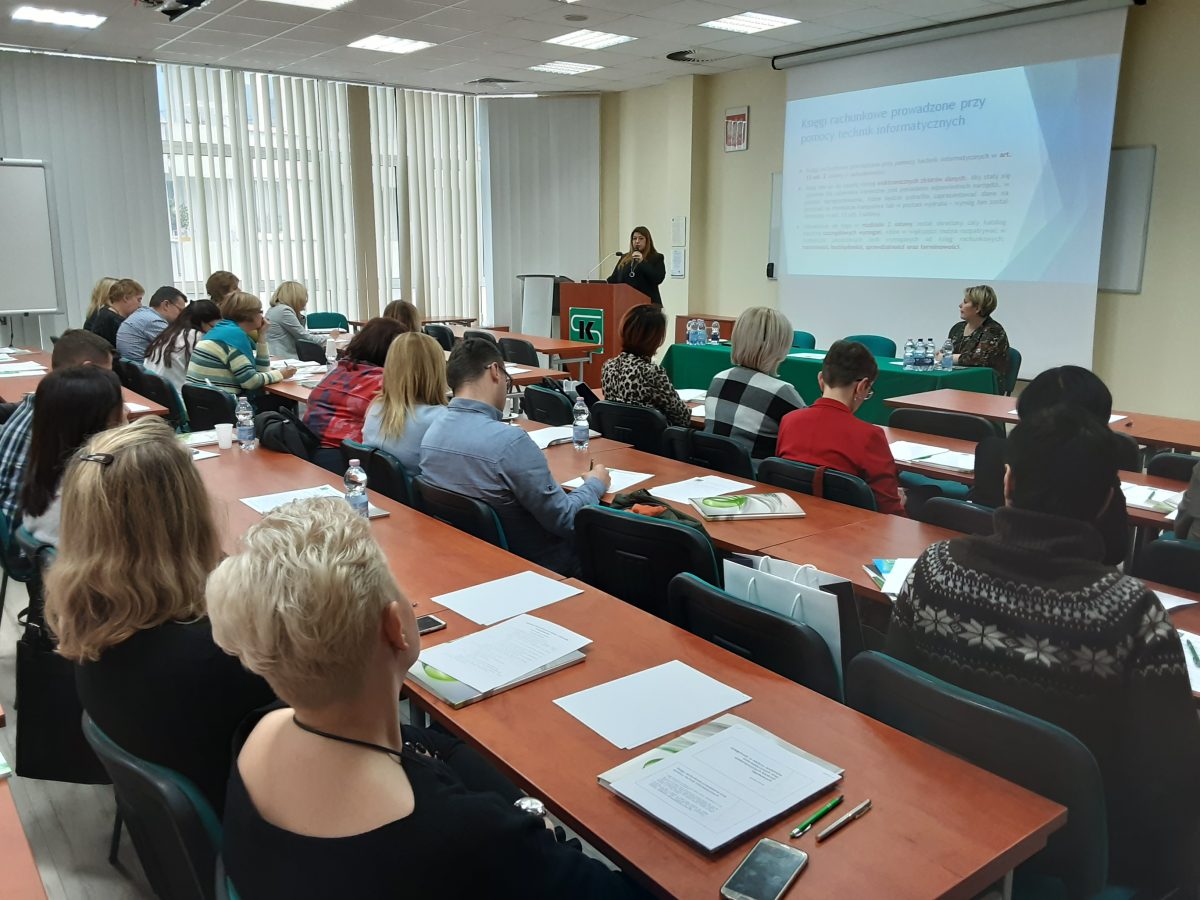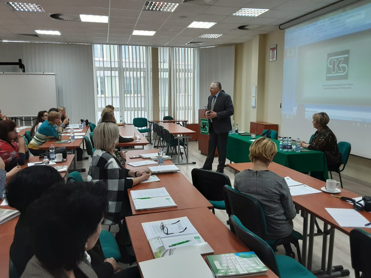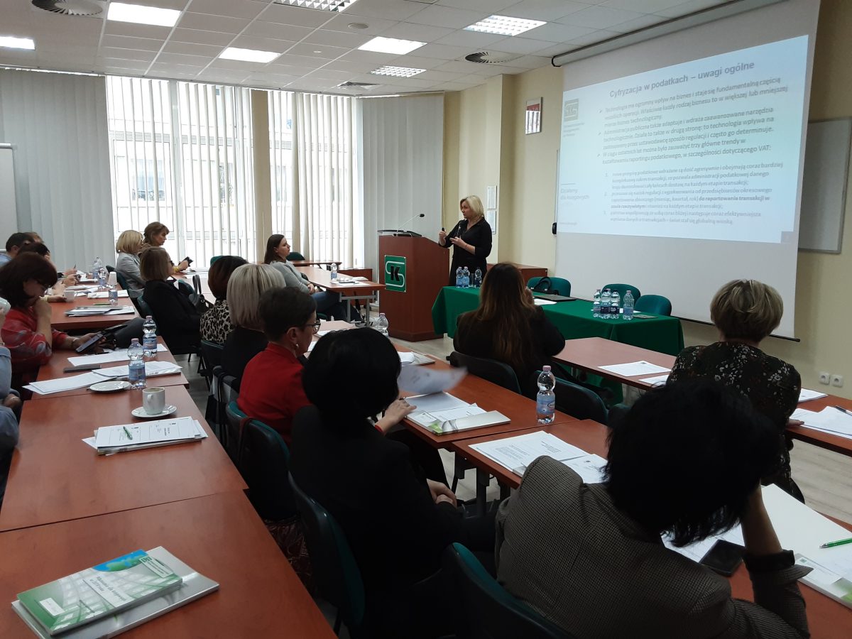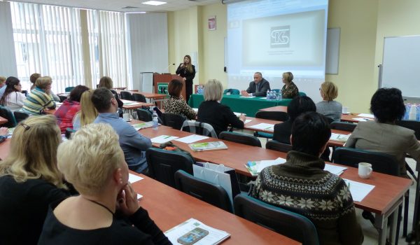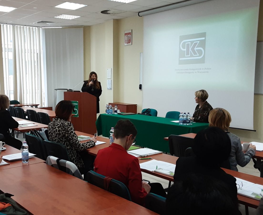 Stowarzyszenie w swojej działalności największy nacisk kładzie na kształcenie zawodowe, zarówno swoich członków jak i uczestników szkoleń oraz kursów, przekazując im zawsze bieżące informacje o zmianach w przepisach czy zmianach w podatkach. Nauczyciele, którzy przybyli na spotkanie także dostali garść takich informacji. Wykład „Księgowy w obliczu systemów informatycznych oraz kontroli skarbowych” poprowadziła Agnieszka Gajewska – biegły rewident, wiceprezes Zarządu O/O w Warszawie SKwP. W swojej prezentacji skupiła się na systemach IT do prowadzenia ksiąg rachunkowych – jakie były kiedyś, jakie są dziś i jakie będą w przyszłości, robotach coraz częściej wykorzystywanych w księgowości i wpływie jaki wywierają na pracę księgowego oraz sprawozdaniach finansowych sporządzanych w formacie XML. Poruszyła także zagadnienia związane z procesami biznesowymi zachodzącymi w jednostkach gospodarczych i ich związku z systemami informatycznymi.