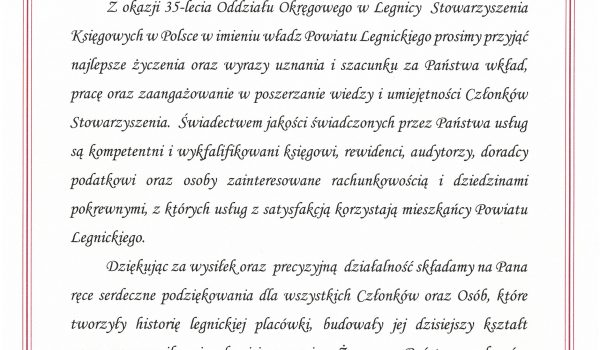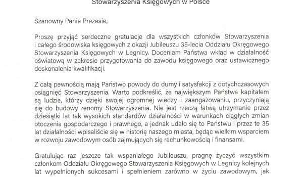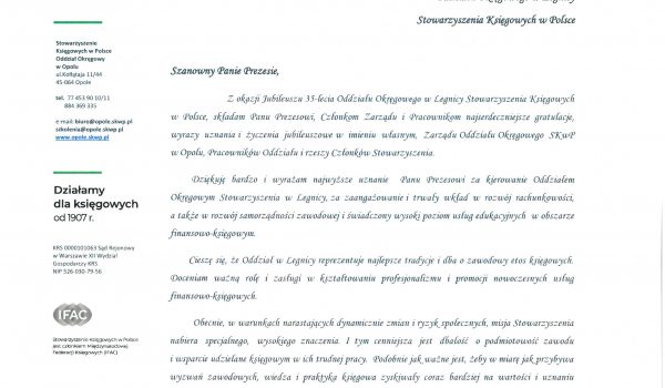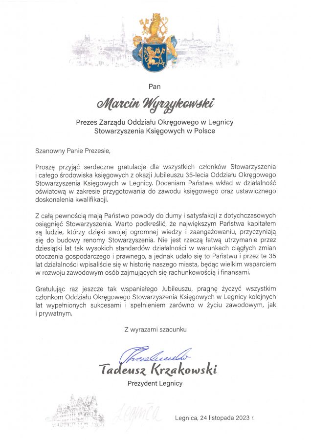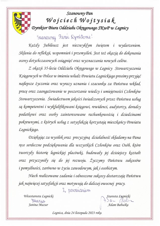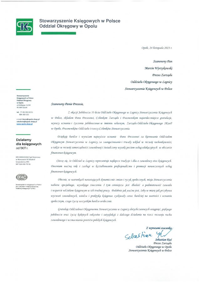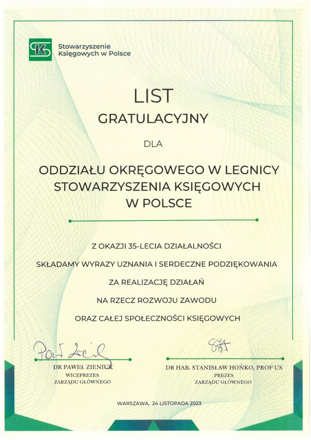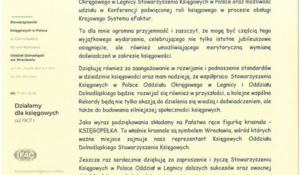 W piątek 24 listopada 2023 roku, w legnickim Hotelu Qubus odbyła się Konferencja: "Rola księgowego w procesie obsługi Krajowego Systemu eFaktur – 35 lat Oddziału Okręgowego w Legnicy Stowarzyszenia Księgowych w Polsce"