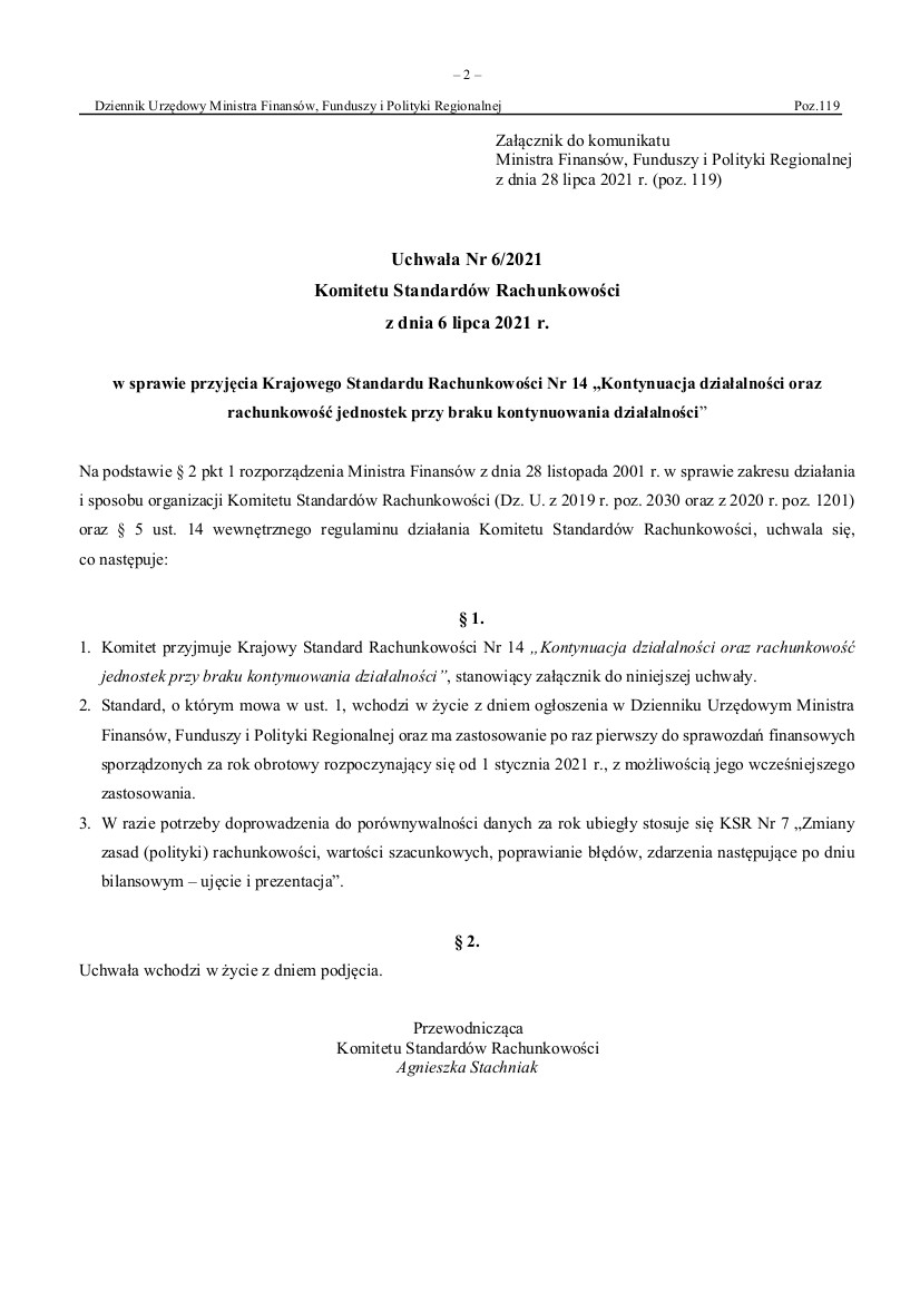 Ogłoszono uchwałę Nr 6/2021 Komitetu Standardów Rachunkowości z dnia 6 lipca 2021 r. w sprawie przyjęcia Krajowego Standardu Rachunkowości Nr 14 „Kontynuacja działalności oraz rachunkowość jednostek przy braku kontynuowania działalności”, stanowiącą załącznik do komunikatu (Dz. Urz. MFFiPR z 10 sierpnia 2021 r. poz. 119).