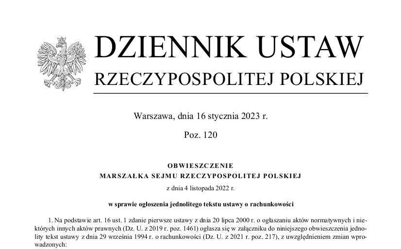 Opublikowano obwieszczenie Marszałka Sejmu Rzeczypospolitej Polskiej z dnia 4 listopada 2022 r. w sprawie ogłoszenia jednolitego tekstu ustawy o rachunkowości (Dz.U. poz. 120)