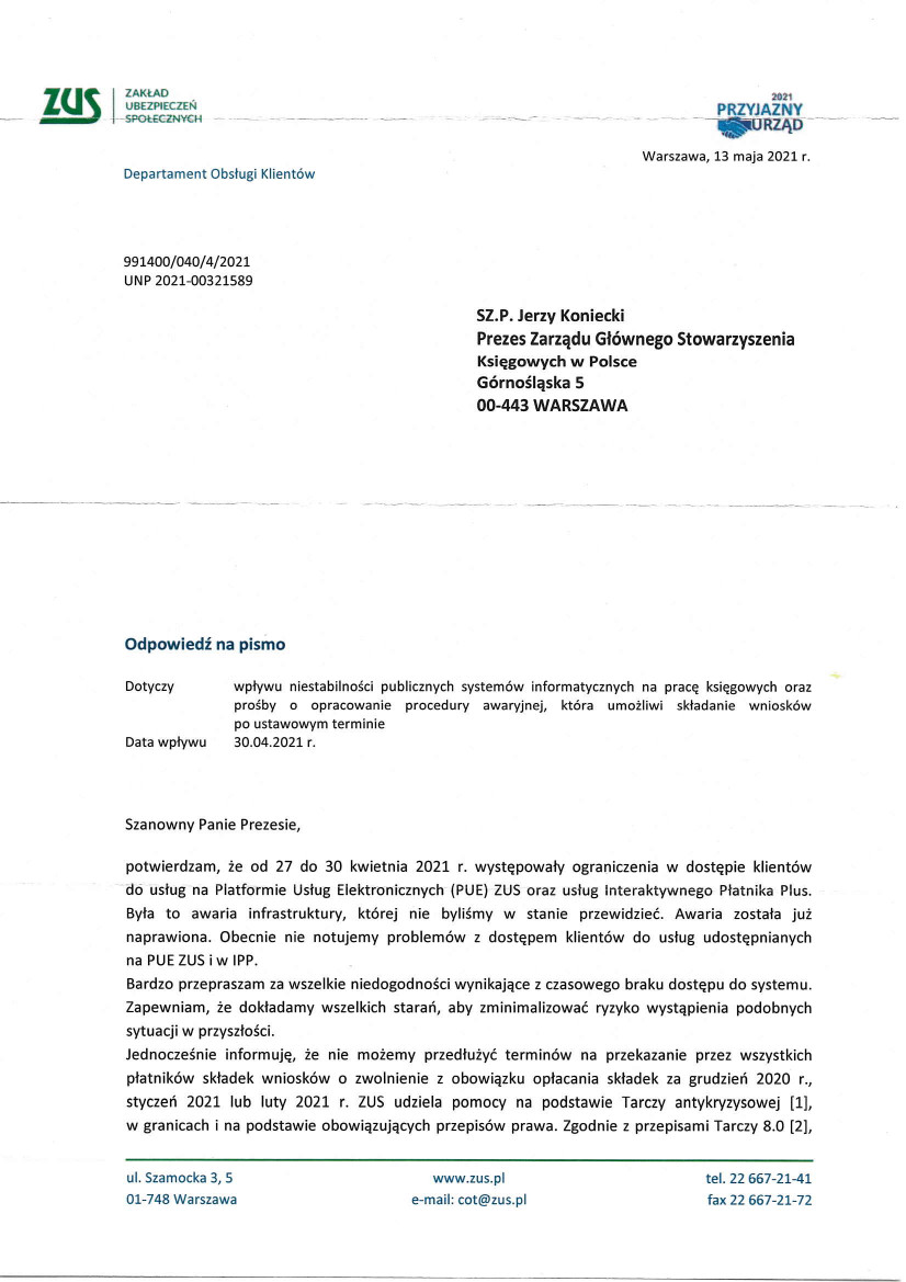 Departament Obsługi Klientów ZUS odpowiedział na pismo SKwP, przesłane 30 kwietnia br. do prof. Gertrudy Uścińskiej - prezes ZUS, w sprawie wpływu niestabilności publicznych systemów informatycznych na pracę księgowych oraz prośby o opracowanie procedury awaryjnej, która umożliwi składanie wniosków po ustawowym terminie.