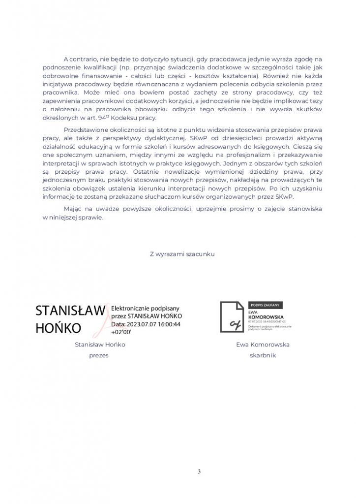 Stowarzyszenie Księgowych w Polsce wystosowało do Minister Rodziny i Polityki Społecznej pismo, z dnia 7.07.2023 r., w sprawie regulacji prawnych na gruncie przepisów Kodeksu pracy dotyczących szkoleń pracowników. Wprowadzone przepisy spowodowały wśród praktyków uzasadnione wątpliwości co do zakresu regulacji i sposobu ich stosowania.