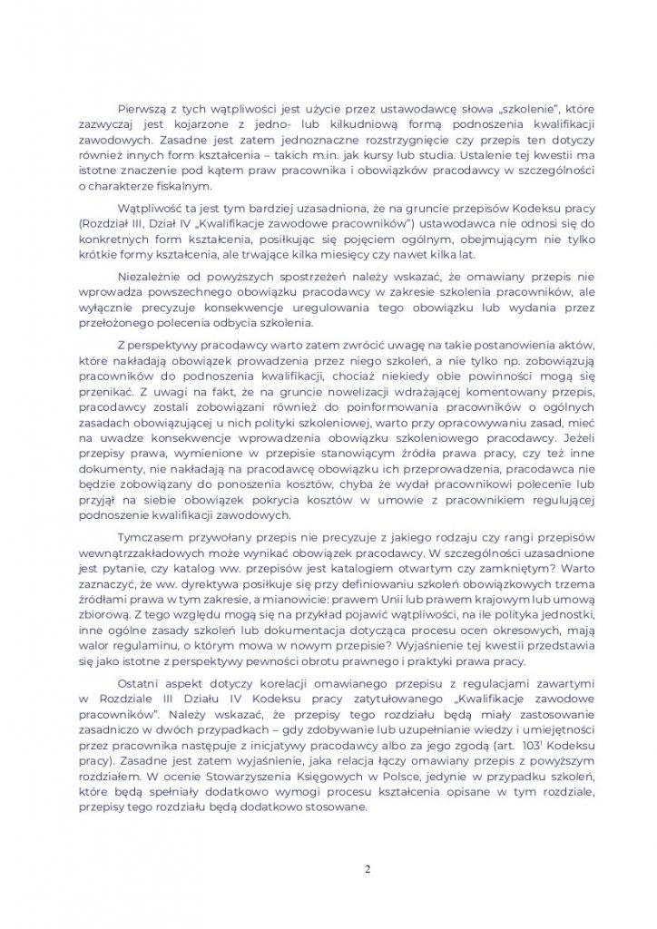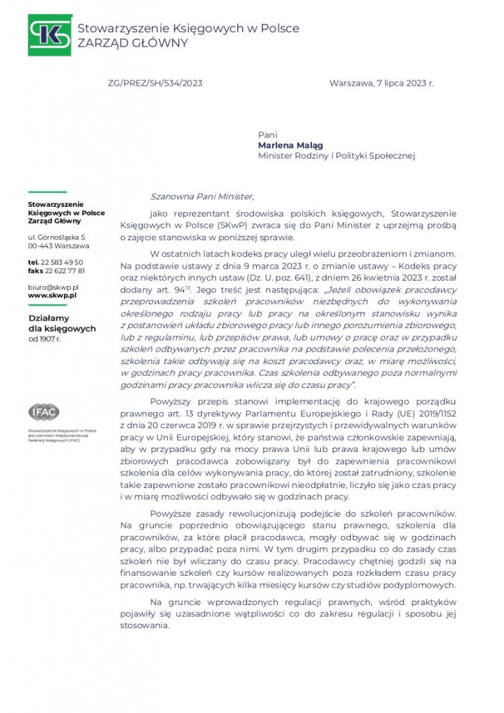 Stowarzyszenie Księgowych w Polsce wystosowało do Minister Rodziny i Polityki Społecznej pismo, z dnia 7.07.2023 r., w sprawie regulacji prawnych na gruncie przepisów Kodeksu pracy dotyczących szkoleń pracowników. Wprowadzone przepisy spowodowały wśród praktyków uzasadnione wątpliwości co do zakresu regulacji i sposobu ich stosowania.