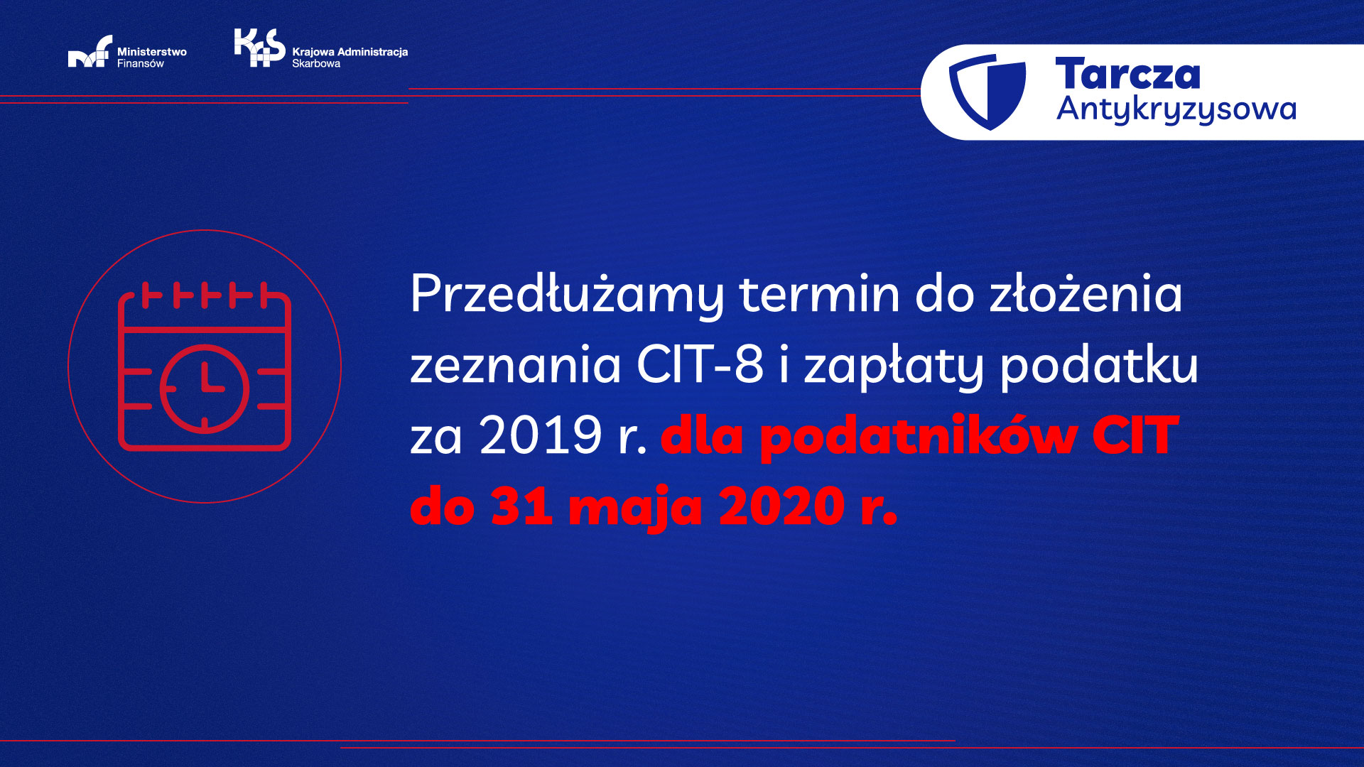 Przedłużony termin do złożenia zeznania CIT-8 i zapłaty podatku za 2019 r. dla podatników CIT do 31 maja 2020 r.