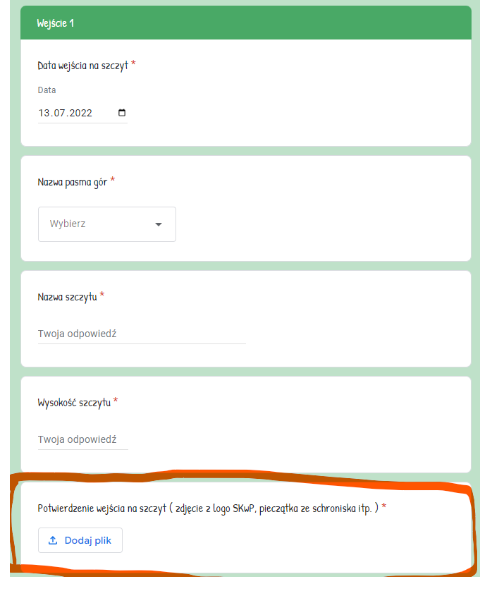 - Zarejestrować wejście wypełniając FORMULARZ! Nie zapomnij w formularzu wgrać zdjęcia z potwierdzeniem zdobycia szczytu.