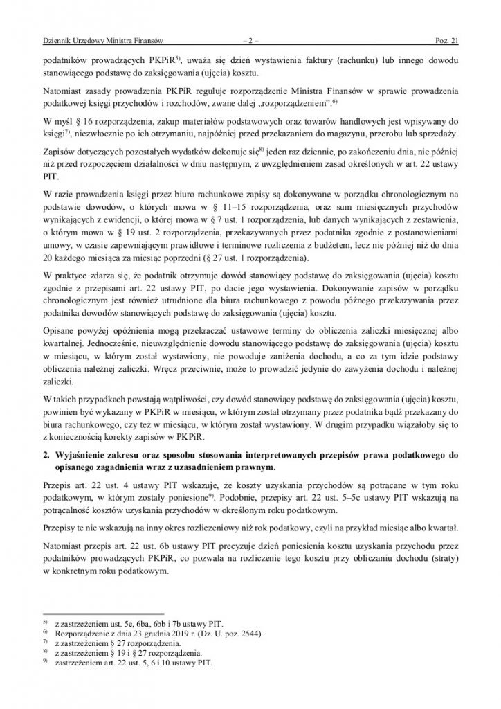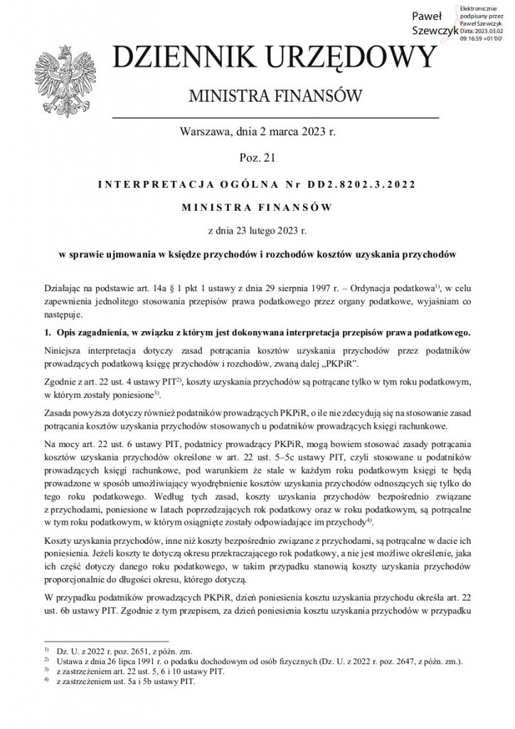 Dnia 2 marca 2023 r. ukazała się Interpretacja Ogólna N r D D 2 . 8 2 0 2 . 3 . 2 0 2 2 Ministra Finansów z dnia 23 lutego 2023 r. w sprawie ujmowania w księdze przychodów i rozchodów kosztów uzyskania przychodów (Dz.U. MF poz. 21).