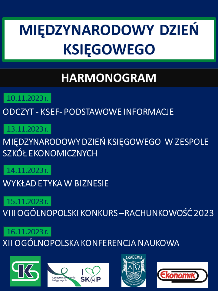 - 15 listopada 2023 r. – VIII Ogólnopolski konkurs – Rachunkowość 2023, dla uczniów szkół ponadpodstawowych.