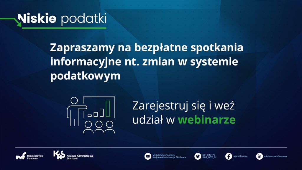 Ministerstwo Finansów (MF) i Krajowa Administracja Skarbowa (KAS) zapraszają do udziału w bezpłatnych spotkaniach informacyjnych nt. zmian w systemie podatkowym. Spotkania są dedykowane m.in. przedsiębiorcom, a także osobom zajmującym się obsługą kadr i płac. Omawiane tematy: