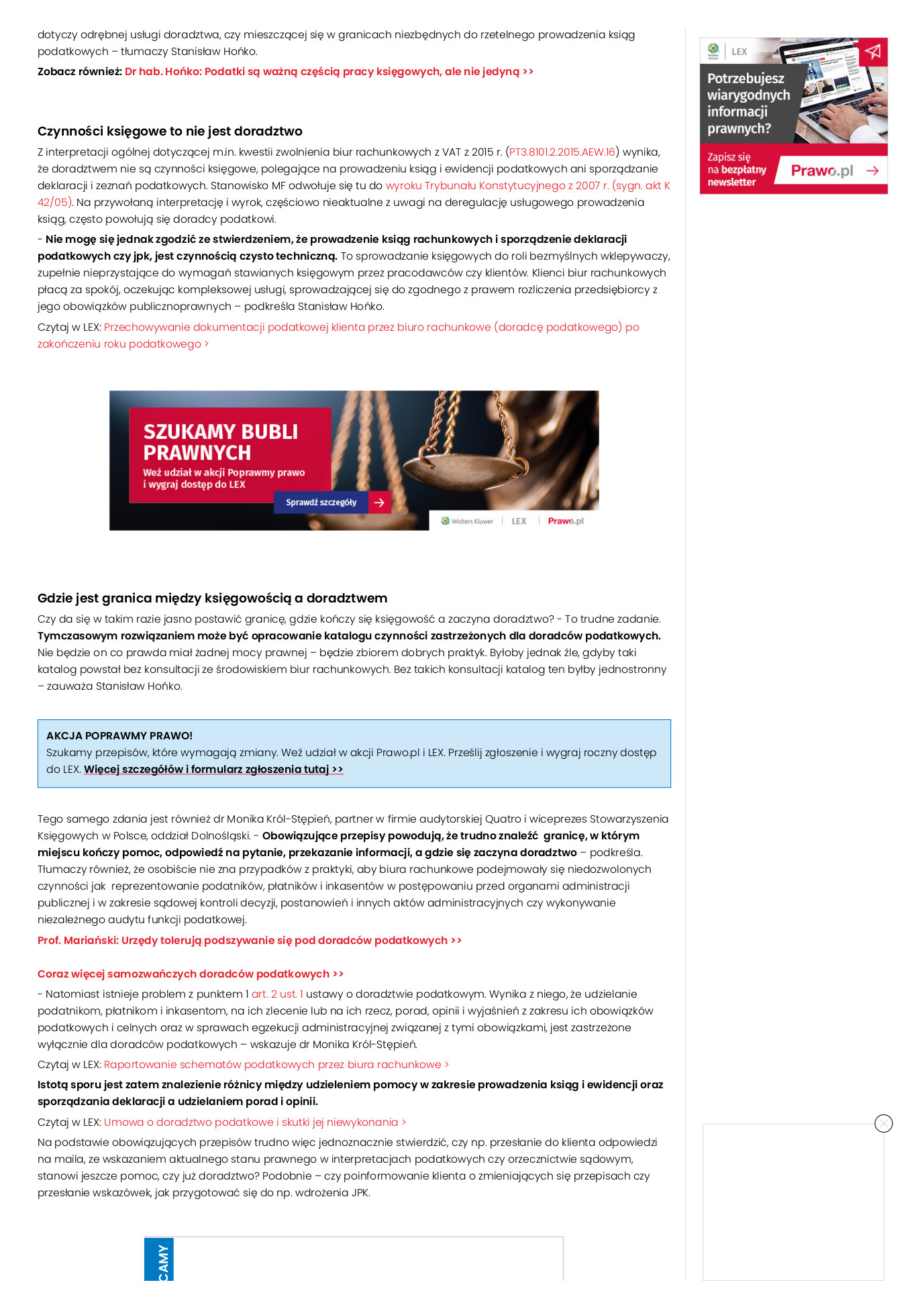 W interpretacji ogólnej dotyczącej m.in. kwestii zwolnienia biur rachunkowych z VAT z 2015 r. (PT3.8101.2.2015.AEW.16) stwierdza się, że doradztwem nie są czynności księgowe, polegające na prowadzeniu ksiąg i ewidencji podatkowych ani sporządzanie deklaracji i zeznań podatkowych. Ta interpretacja odwołuje się do wyroku Trybunału Konstytucyjnego z 2007 r. (sygn. akt K 42/05) Na przywołaną interpretację i wyrok, częściowo nieaktualne z uwagi na deregulację usługowego prowadzenia ksiąg, często powołują się doradcy podatkowi. Nie mogę się zgodzić z powielanym stwierdzeniem, że prowadzenie ksiąg rachunkowych i sporządzenie deklaracji podatkowych czy jpk, jest czynnością czysto techniczną. To sprowadzanie księgowych do roli bezmyślnych wklepywaczy, zupełnie nieprzystające do wymagań stawianych księgowym przez pracodawców czy klientów. Klienci biur rachunkowych płacą za spokój, oczekując kompleksowej usługi, sprowadzającej się do zgodnego z prawem rozliczenia przedsiębiorcy z jego obowiązków publicznoprawnych. Do wykonania tej usługi potrzebna jest ogromna wiedza i dobra współpraca z klientem.