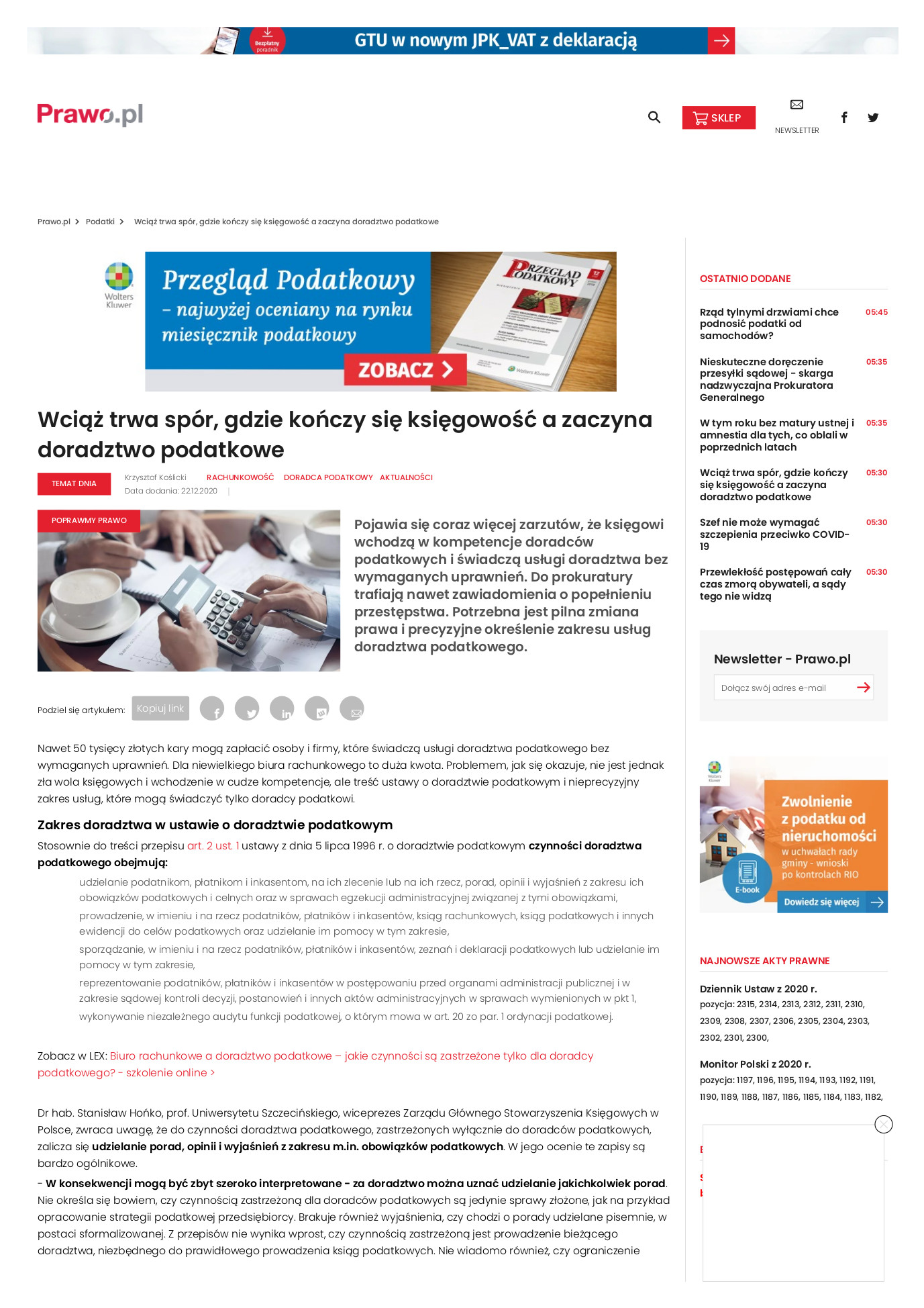 W czasie pandemii to właśnie księgowi, w tym pracujący w biurach rachunkowych byli, i są nadal, na pierwszej linii frontu, wspierając przedsiębiorców w pozyskaniu i rozliczaniu środków z tarcz antykryzysowych. To w tym gorącym czasie wypłynął stary temat, którego źródłem są archaiczne zapisy ustawy o doradztwie podatkowym, obowiązujące od niemal ćwierć wieku. W art. 2 tej ustawy do czynności doradztwa podatkowego, zastrzeżonych wyłącznie dla doradców podatkowych, zalicza się udzielanie porad, opinii i wyjaśnień z zakresu m.in. obowiązków podatkowych. W mojej ocenie te zapisy są bardzo ogólnikowe. W konsekwencji mogą być zbyt szeroko interpretowane - za doradztwo można uznać udzielanie jakichkolwiek porad. Nie określa się bowiem, czy czynnością zastrzeżoną dla doradców podatkowych są jedynie sprawy złożone, jak na przykład opracowanie strategii podatkowej przedsiębiorcy. Brakuje również wyjaśnienia, czy chodzi o porady udzielane pisemnie, w postaci sformalizowanej. Z przepisów nie wynika wprost, czy czynnością zastrzeżoną jest prowadzenie bieżącego doradztwa, niezbędnego do prawidłowego prowadzenia ksiąg podatkowych. Nie wiadomo również, czy ograniczenie dotyczy odrębnej usługi doradztwa, czy mieszczącej się w granicach niezbędnych do rzetelnego prowadzenia ksiąg podatkowych. Co interesujące, mimo długiego stażu tych nieprecyzyjnych zapisów, orzecznictwo dotyczące art. 2 ustawy o doradztwie podatkowym jest raczej skromne. Może to świadczyć o tym, że problem nieuprawnionego doradztwa podatkowego nie był zjawiskiem powszechnym w rzeczywistości gospodarczej, a temat wrócił głównie z powodu burzy medialnej.