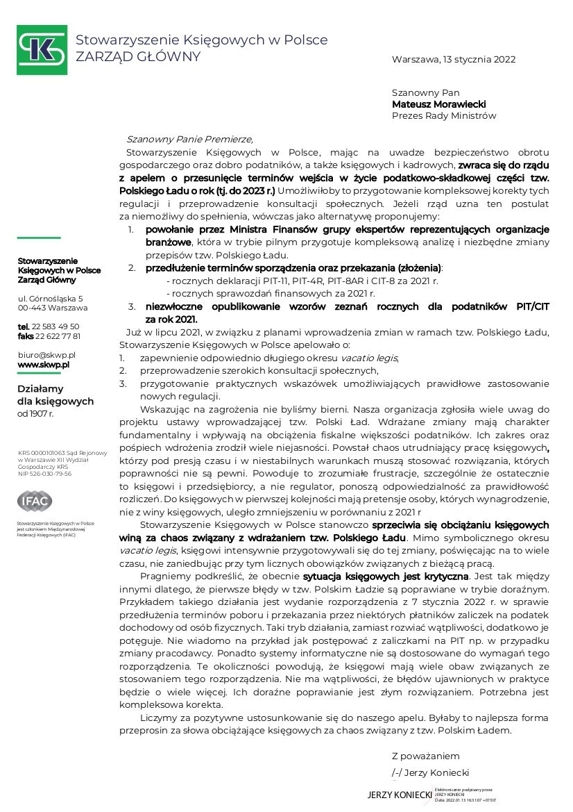 Mająca obecnie sytuacja niestabilności warunków oraz niepewności rozwiązań systemowych spowodowała, że księgowi i kadrowi znaleźli się w krytycznej sytuacji. Poziom frustracji osiągnął maksimum, gdy za chaos związany z wdrażaniem Polskiego Ładu zaczęto obwiniać księgowych. Z uwagi na tę krytyczną sytuację, Zarząd Główny Stowarzyszenia Księgowych w Polsce zwrócił się do Prezesa Rady Ministrów Mateusza Morawieckiego. o przesunięcie terminu wejścia w życie części przepisów dot. Polskiego ładu. Całą treść apelu załączamy poniżej.