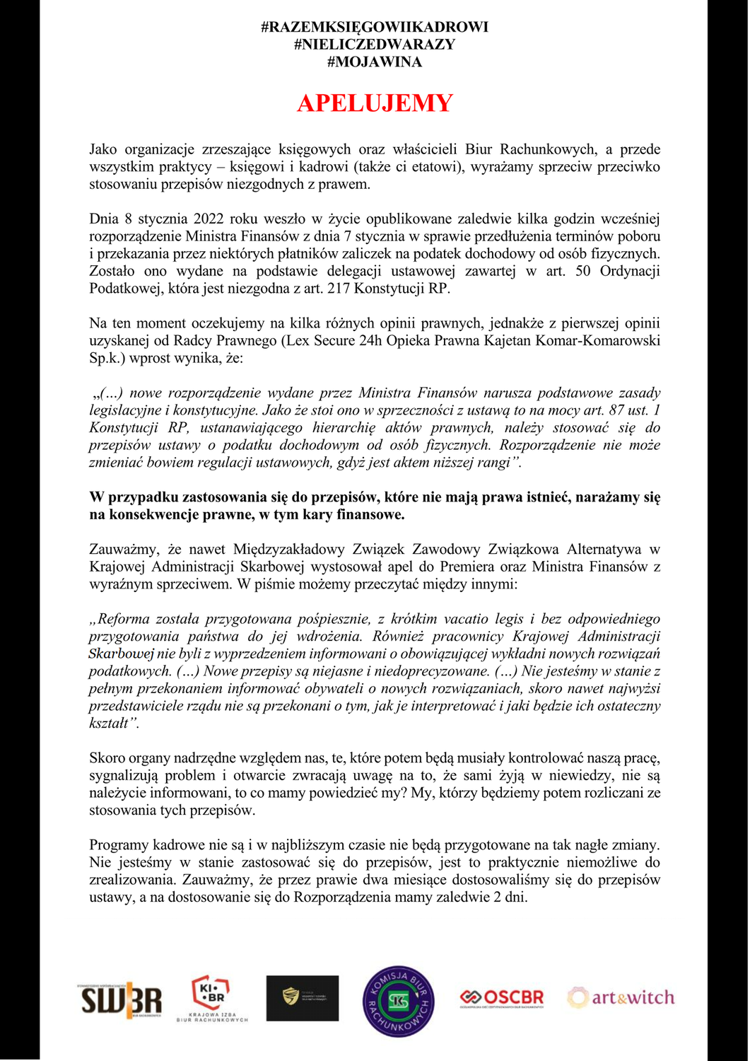 W imieniu wszystkich księgowych i kadrowych, organizacje zrzeszające biura rachunkowe przygotowały apel w sprawie rozporządzenia Ministra Finansów z dnia 07 stycznia 2022 r. Całą treść apelu prezentujemy poniżej.