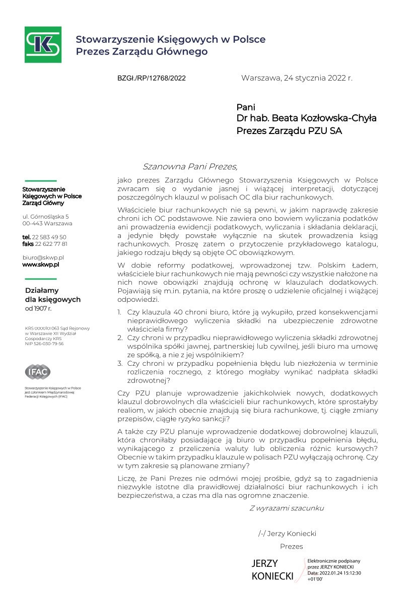 Będąc profesjonalistami wiemy, jak bardzo ważne jest ubezpieczenie OC w usługowym prowadzeniu ksiąg. W związku z niepewną sytuacją w jakiej znalazły się biura rachunkowe, Jerzy Koniecki Prezes Stowarzyszenia Księgowych w Polsce zwrócił się do Prezes PZU S.A., o wydanie wiążącej interpretacji dot. poszczególnych klauzul w polisach OC dla biur rachunkowych. Treść listu udostępniamy poniżej.