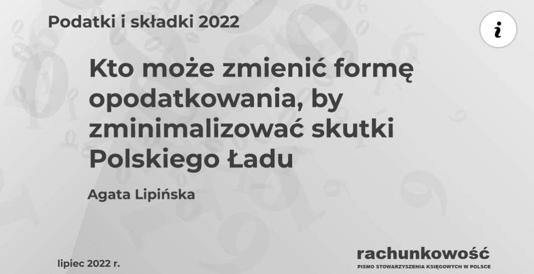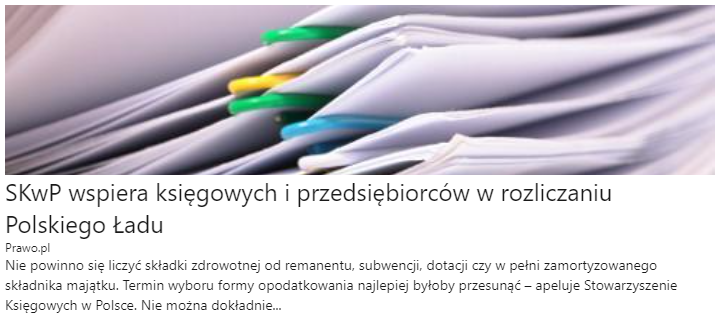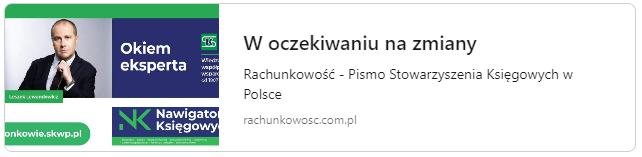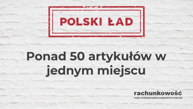 Na stronie Wydawnictwa Rachunkowość (rachunkowosc.com.pl) zamieszczono wiele artykułów odnoszących się do Polskiego Ładu przygotowanych przez ekspertów Stowarzyszenia Księgowych w Polsce (SKwP). Zachęcamy do ich lektury – z pewnością pomogą rozjaśnić wiele niejasności, związanych z przepisami Polskiego Ładu.