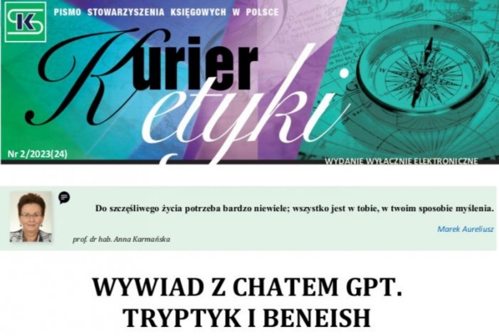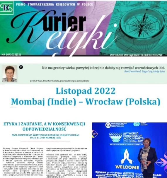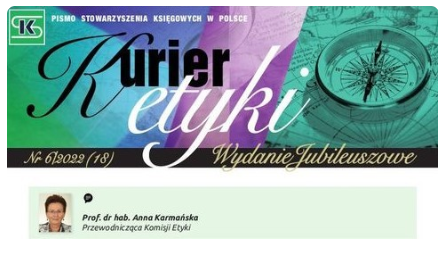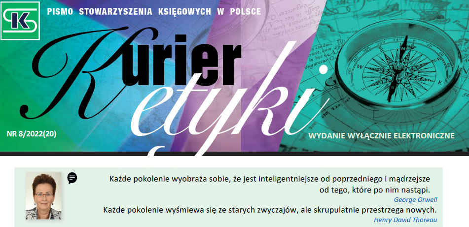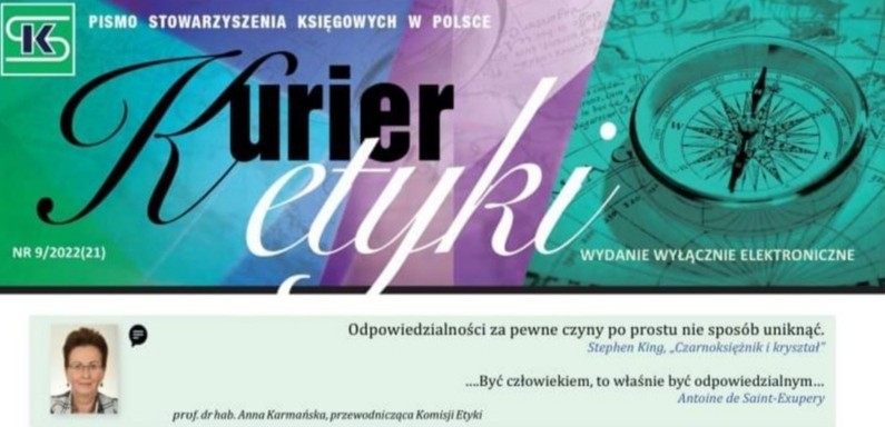 Promotorem serii Kuriera Etyki poświęconego Etyce w życiu gospodarczym jest pani Grażyna Urbaniak (członek Komisji Etyki SKwP), która poniżej przedstawia syntetyczną charakterystykę zawartości bieżącego numeru. Życzę Państwu refleksyjnej lektury. Natomiast z okazji Dnia Księgowego – wszelkiej zawodowej pomyślności!" - Prof. dr hab. Anna Karmańska, Przewodnicząca Komisji Etyki