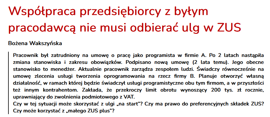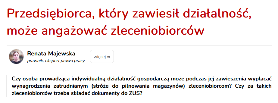 „Indywidualni przedsiębiorcy będą mogli – nie tracąc prawa do ubezpieczeń – przez 1 miesiąc w roku nie płacić składek ZUS, które zrefunduje budżet państwa. Z ulgi skorzystają najwcześniej za grudzień 2024 r" - Renata Majewska, prawnik, ekspert prawa pracy
