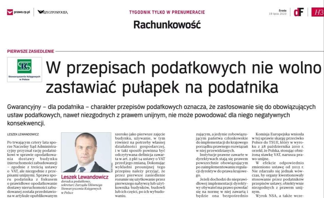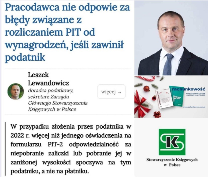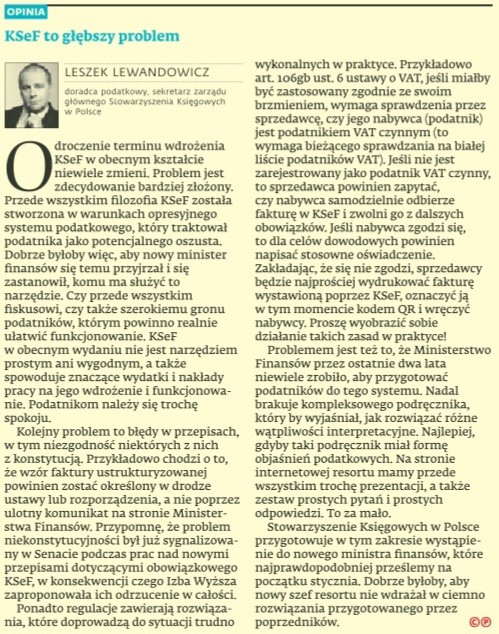 „Ostatnie lata były trudnym okresem dla księgowych i rozliczanych przez nich podatników. Przemiana polityczna, która dokonała się pod koniec ubiegłego roku, przyniosła nadzieję na poprawienie oraz uproszczenie wielu przepisów, ograniczenie zbędnych i uciążliwych obowiązków administracyjnych, a także na ogólną zmianę podejścia do przedsiębiorców. Na razie jednak wiele osób może czuć rozczarowanie, wynikające w szczególności z aktualnych problemów, omówionych poniżej" - Leszek Lewandowicz, doradca podatkowy, sekretarz Zarządu Głównego SKwP