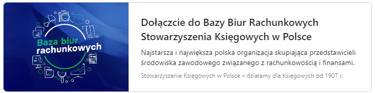 Zachęcamy wszystkie biura rachunkowe do wpisania się do Bazy Biur Rachunkowych Stowarzyszenia Księgowych w Polsce. Celem bazy jest zebranie biur rachunkowych, które cechują się profesjonalizmem, rzetelnością i wiarygodnością na rynku.