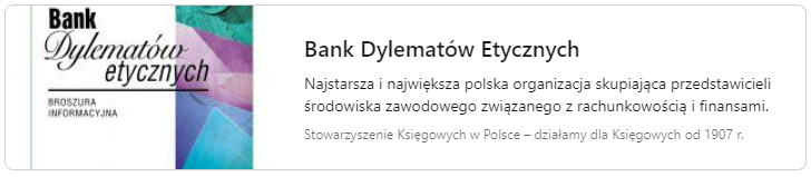 Komisja Profesjonalizmu Zawodu Księgowego Rady Naukowej Stowarzyszenia Księgowych w Polsce przedstawia Państwu inicjatywę tworzenia banku analiz przypadków, zwanego Bankiem Dylematów Etycznych, które mogą wspomagać propagowanie i wdrażanie zasad etyki w środowisku zawodowym rachunkowości. Działania w kierunku stworzenia takiego Banku podjęte zostały już w roku 2006.