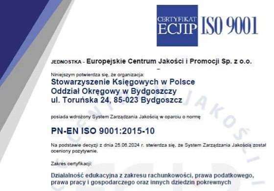 Serdecznie gratulujemy Stowarzyszenie Księgowych w Polsce Oddział Okręgowy w Bydgoszczy , który na prowadzoną działalność szkoleniową otrzymał normę ISO 90001:2015. Jesteśmy niezmiernie dumni i życzymy kolejnych sukcesów!