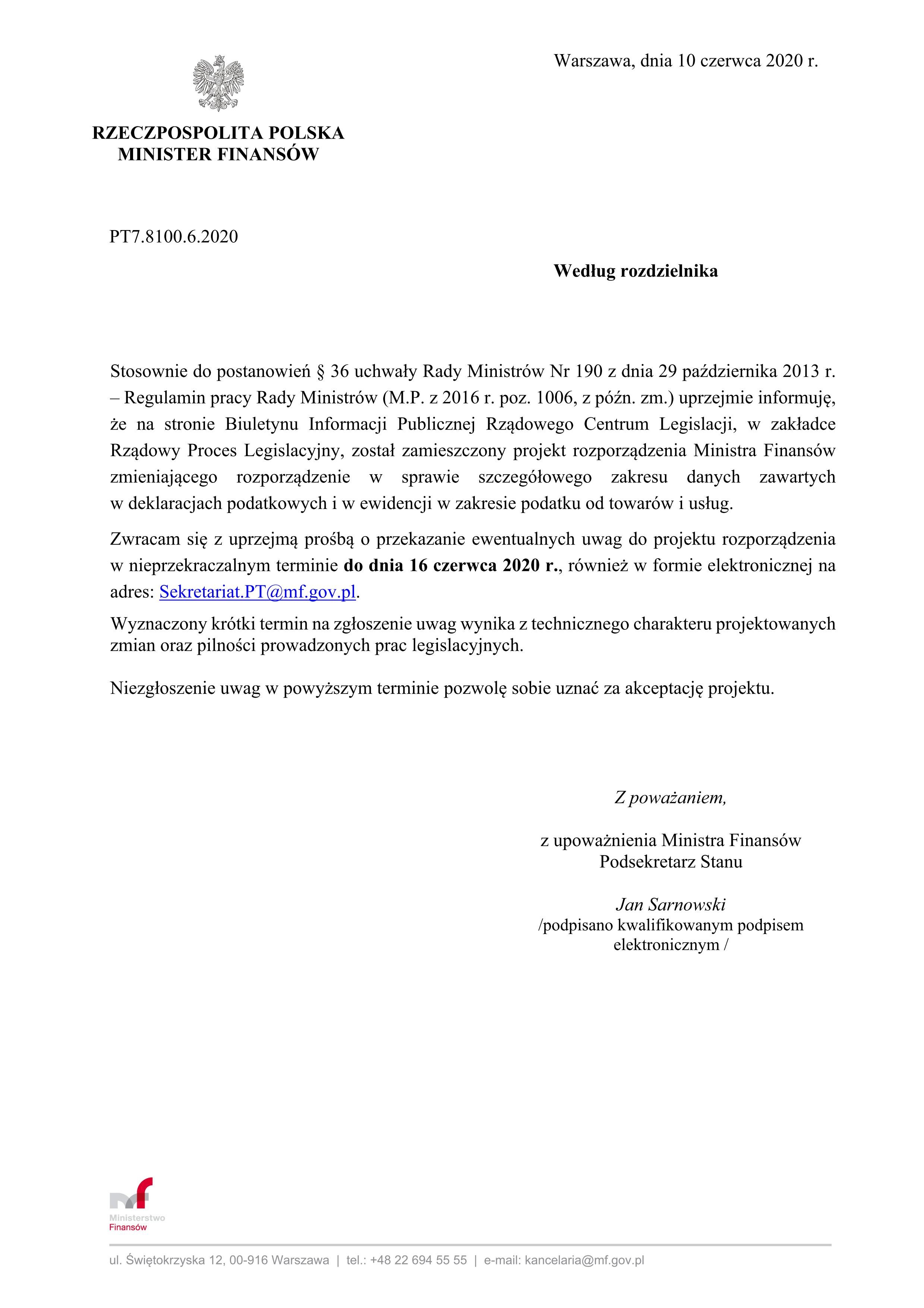 Projekt z dnia 2 czerwca 2020 r. - rozporządzenie Ministra Finansów z dnia ... 2020 r. zmieniające rozporządzenie w sprawie szczegółowego zakresu danych zawartych w deklaracjach podatkowych i w ewidencji w zakresie podatku od towarów i usług
