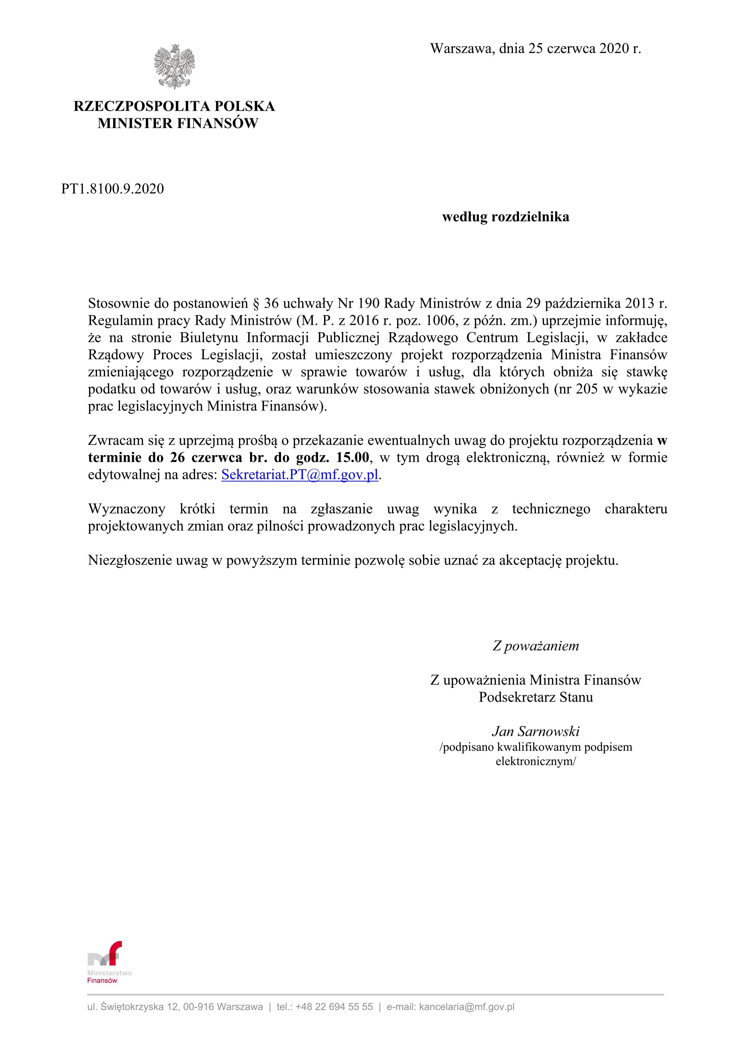 Projekt z dnia 24 czerwca 2020 r. - rozporządzenie Ministra Finansów z dnia ... 2020 r. w sprawie towarów i usług, dla których obniża się stawkę podatku od towarów i usług, oraz warunków stosowania stawek obniżonych