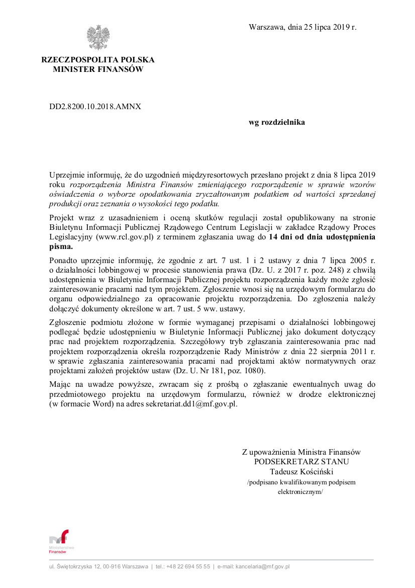 Projekt z dnia 8 lipca 2019 r. - rozporządzenie Ministra Finansów z dnia ... zmieniające rozporządzenie w sprawie wzorów oświadczenia o wyborze opodatkowania zryczałtowanym podatkiem od wartości sprzedanej produkcji oraz zeznania o wysokości tego podatku
