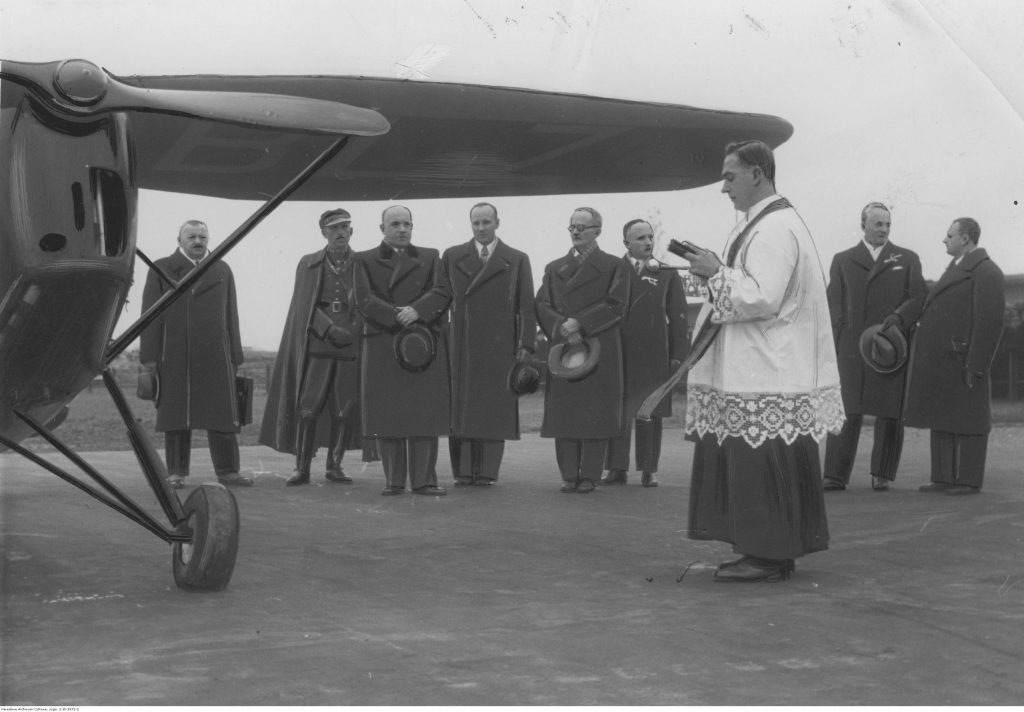 - Ksiądz prefekt Baksik, w otoczeniu członków komitetu organizacyjnego zjazdu i członków ZG Związku, święci samolot RWD-10 "Księgowy" o numerach SP-BLZ