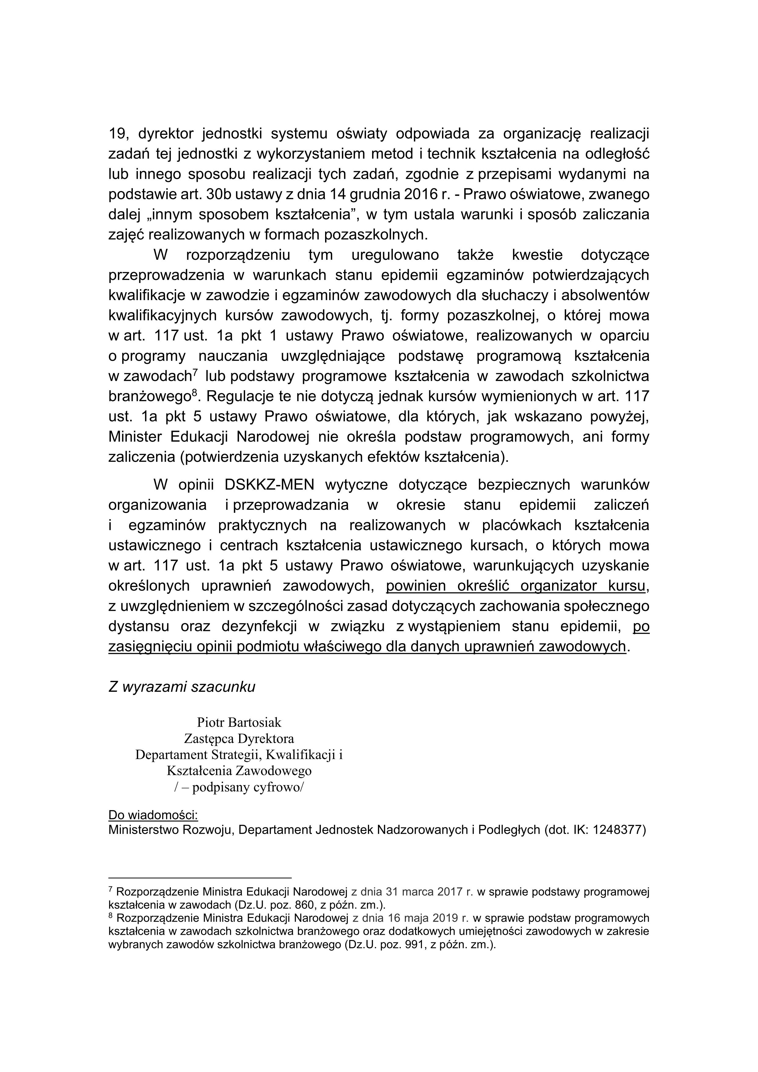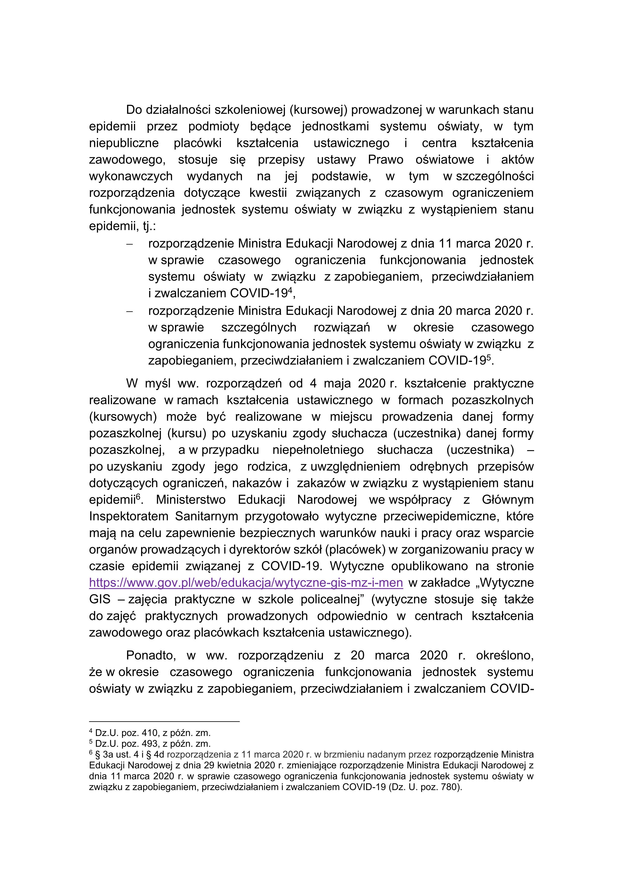 "W myśl ww. rozporządzeń od 4 maja 2020 r. kształcenie praktyczne realizowane w ramach kształcenia ustawicznego w formach pozaszkolnych (kursowych) może być realizowane w miejscu prowadzenia danej formy pozaszkolnej (kursu) po uzyskaniu zgody słuchacza (uczestnika) danej formy pozaszkolnej, a w przypadku niepełnoletniego słuchacza (uczestnika) – po uzyskaniu zgody jego rodzica, z uwzględnieniem odrębnych przepisów dotyczących ograniczeń, nakazów i zakazów w związku z wystąpieniem stanu epidemii[1]. Ministerstwo Edukacji Narodowej we współpracy z Głównym Inspektoratem Sanitarnym przygotowało wytyczne przeciwepidemiczne, które mają na celu zapewnienie bezpiecznych warunków nauki i pracy oraz wsparcie organów prowadzących i dyrektorów szkół (placówek) w zorganizowaniu pracy w czasie epidemii związanej z COVID-19."