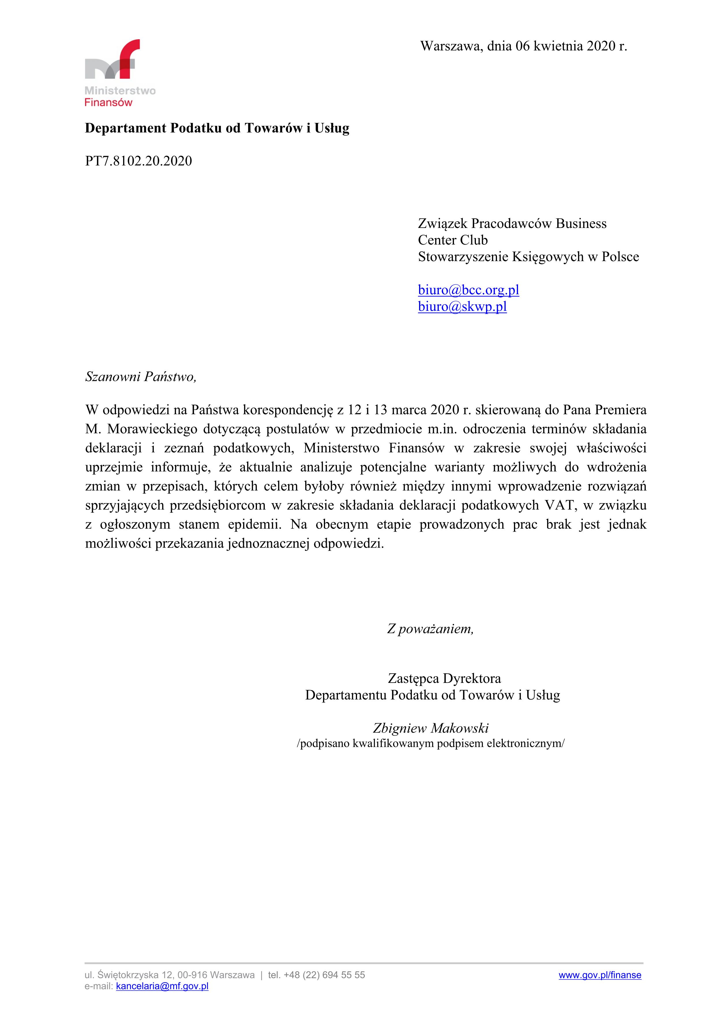 W odpowiedzi na Państwa korespondencję z 12 i 13 marca 2020 r. skierowaną do Pana Premiera M. Morawieckiego dotyczącą postulatów w przedmiocie m.in. odroczenia terminów składania deklaracji i zeznań podatkowych, Ministerstwo Finansów w zakresie swojej właściwości uprzejmie informuje, że aktualnie analizuje potencjalne warianty możliwych do wdrożenia zmian w przepisach, których celem byłoby również między innymi wprowadzenie rozwiązań sprzyjających przedsiębiorcom w zakresie składania deklaracji podatkowych VAT, w związku z ogłoszonym stanem epidemii. Na obecnym etapie prowadzonych prac brak jest jednak możliwości przekazania jednoznacznej odpowiedzi.