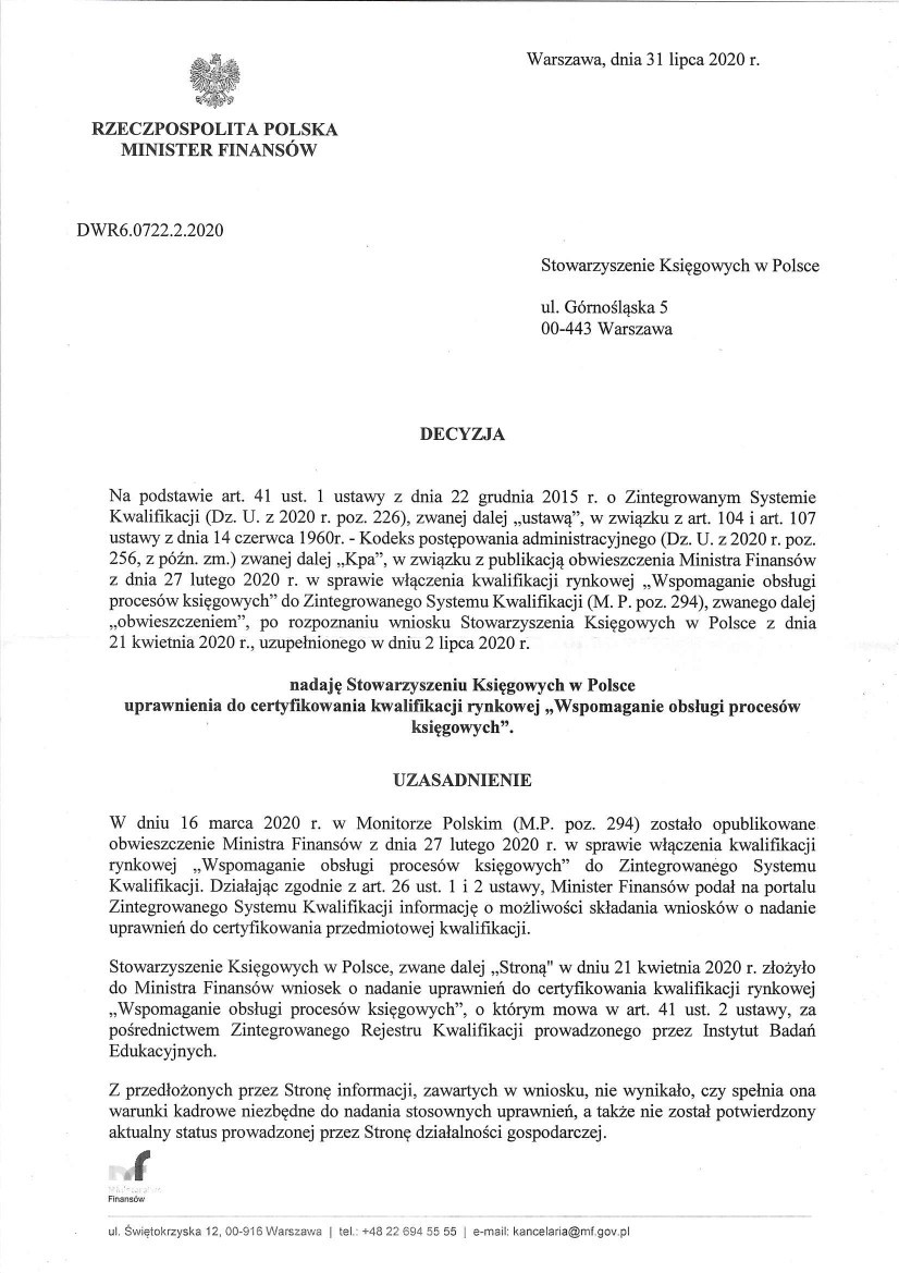 Decyzja w sprawie nadania uprawnień do certyfikowania kwalifikacji