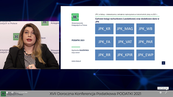 | Kolejny, ważny temat dla księgowych "JPK i e-faktury – doświadczenia z wdrożenia i wykorzystania w trakcie kontroli zewnętrznych i wewnętrznych oraz sprawozdawczości, plany na 2021 rok" zaprezentowała p. Agnieszka Gajewska, biegły rewident.
