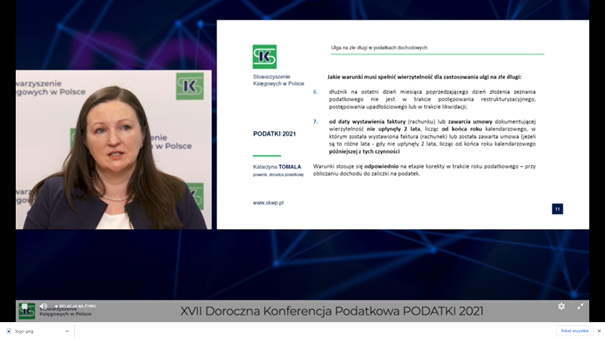 | Temat "Ulga na złe długi w podatkach dochodowych" zaprezentowała p. Katarzyna Tomala, prawnik, doradca podatkowy.