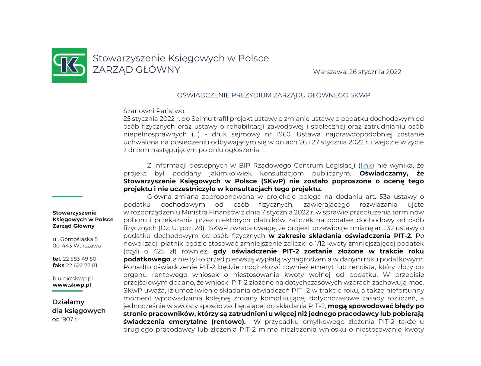 W dniu 9 lutego 2022 r. Sejm uchwalił ustawę o zmianie ustawy – Kodeks spółek handlowych oraz niektórych innych ustaw (przekazana do Senatu). Zmiana rozwiązuje na razie jeden z wielu problemów zgłaszanych Ministerstwu Finansów przez SKwP. (...) |