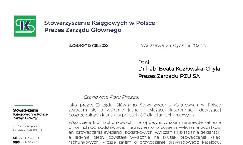 Ubezpieczenia dla biur rachunkowych - kolejne pismo do prezes PZU SA