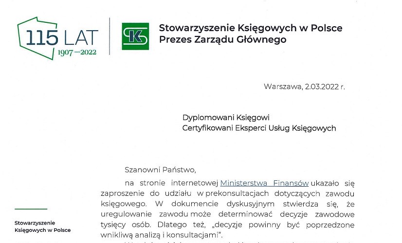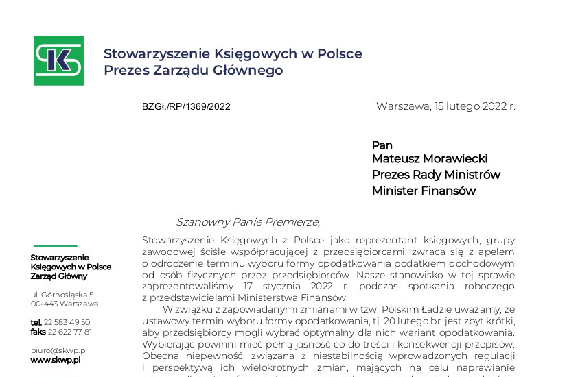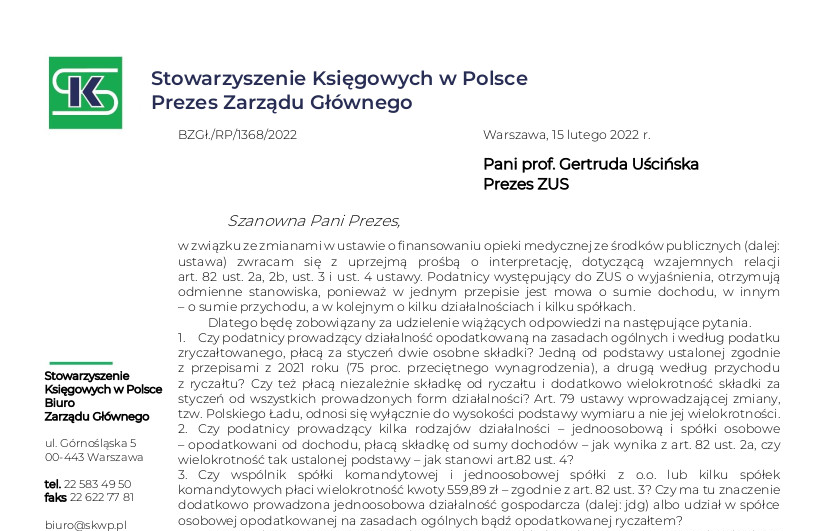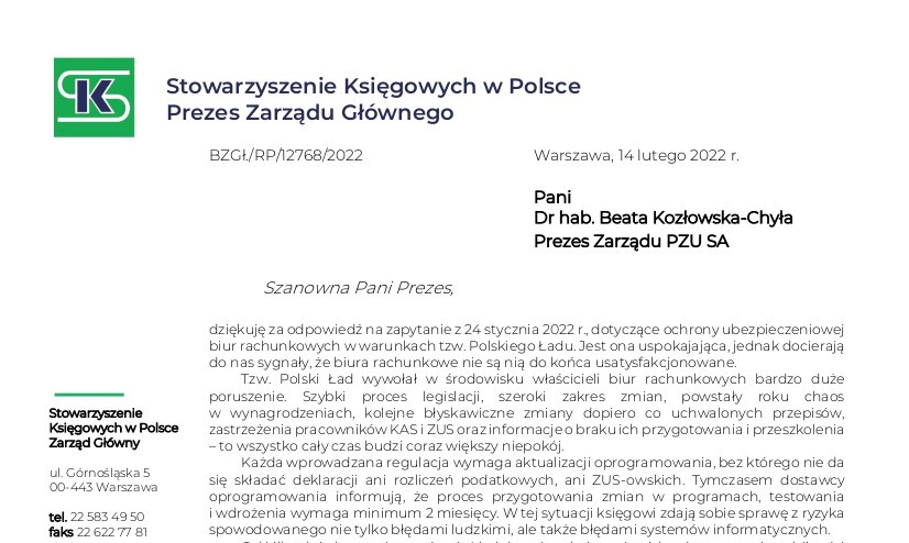 Otrzymana z PZU odpowiedź na pismo z 24 stycznia 2022 r., dotyczące ochrony ubezpieczeniowej biur rachunkowych w warunkach tzw. Polskiego Ładu, nie wyjaśniła do końca zgłoszonych problemów. Dlatego Stowarzyszenie Księgowych w Polsce ponowiło prośbę o udzielenie jednoznacznych odpowiedzi na zadane pytania. (...) |