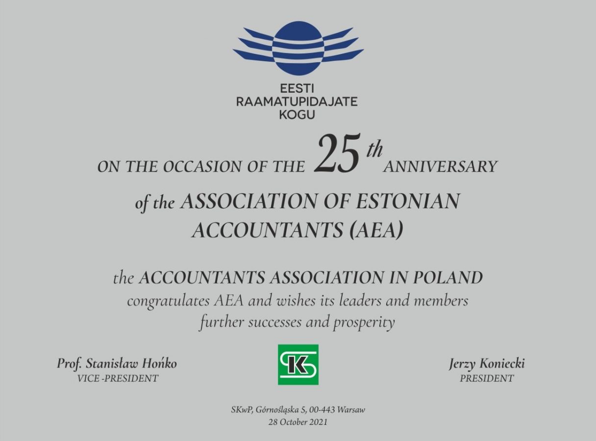 W dniach 28-29 października 2021 r. odbyły się obchody ćwierćwiecza Stowarzyszenia Księgowych w Estonii (Association of Estonian Accountants – AEA). Obchody zostały podzielone na dwa dni. W pierwszym dniu odbyła się uroczysta gala, w której wzięli udział zagraniczni goście, reprezentujący organizacje zrzeszające księgowych w Niemczech, Austrii, Finlandii, Turcji oraz w Polsce. Przedstawiciele AEA wyrazili otwartość na dalszą współpracę z SKwP.