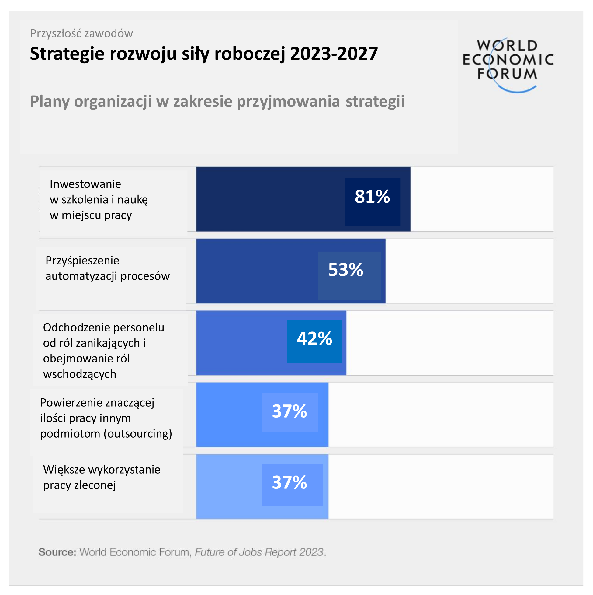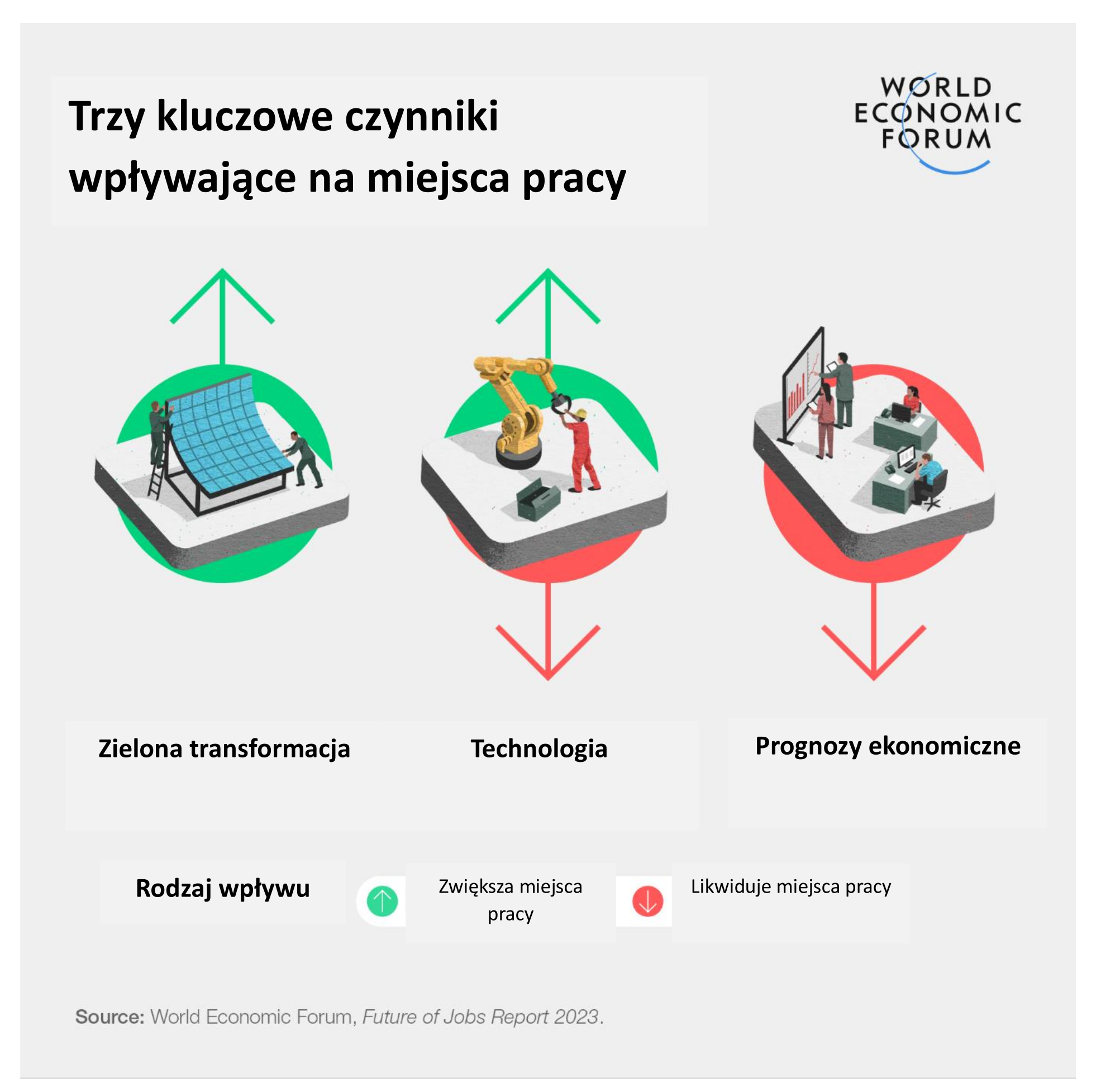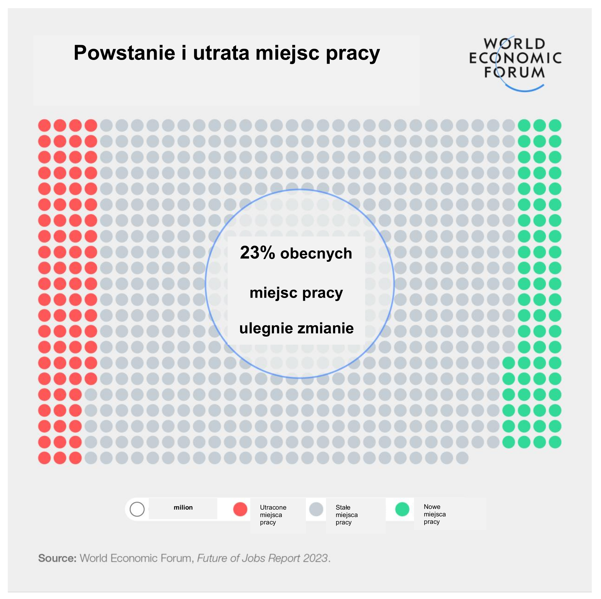W 2023 r. przełomy technologiczne, a zwłaszcza rozwój generatywnej sztucznej inteligencji (AI) i zielona transformacja, krzyżują się z czynnikami gospodarczymi, geopolitycznymi, społecznymi i środowiskowymi, poszerzając zakres raportu. Edycja 2023 została oparta na badaniu 803 firm zatrudniających ponad 11,3 mln pracowników, obejmując 27 klastrów branżowych i 45 gospodarek z całego świata.