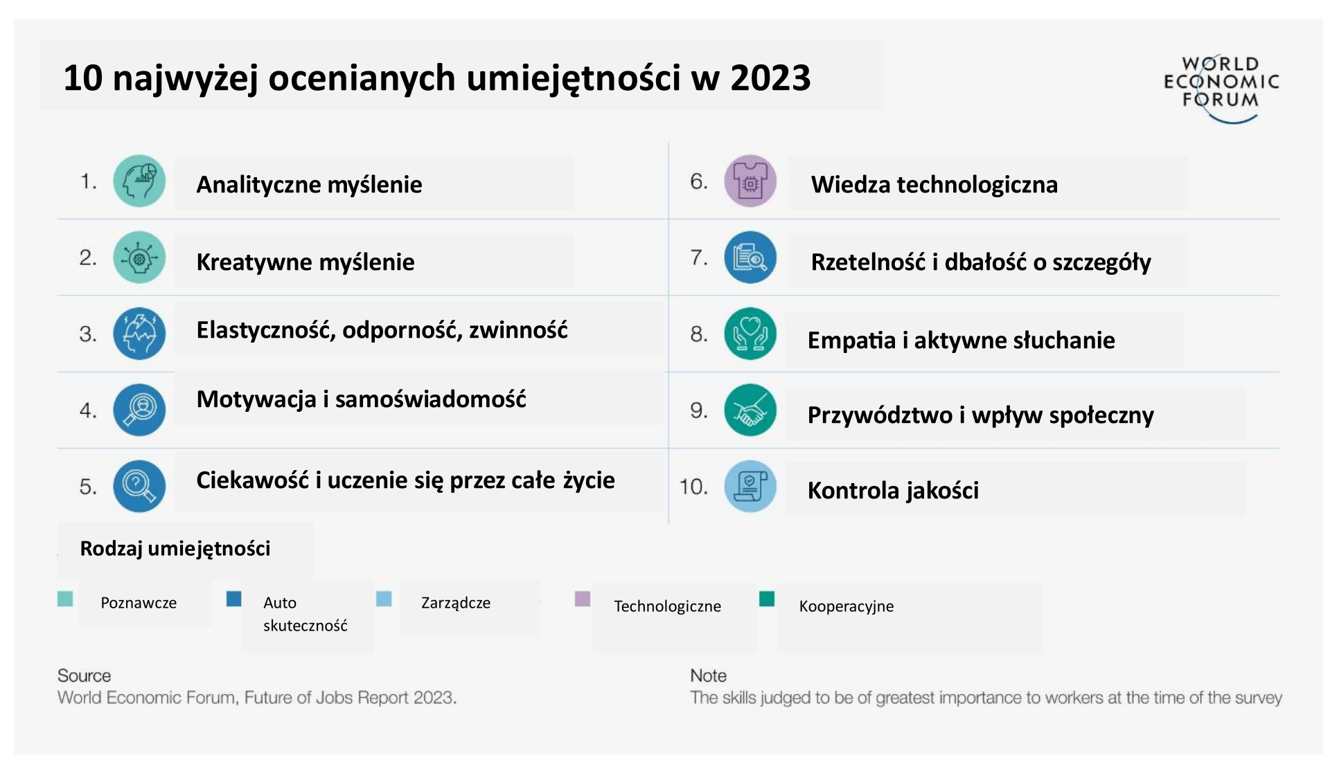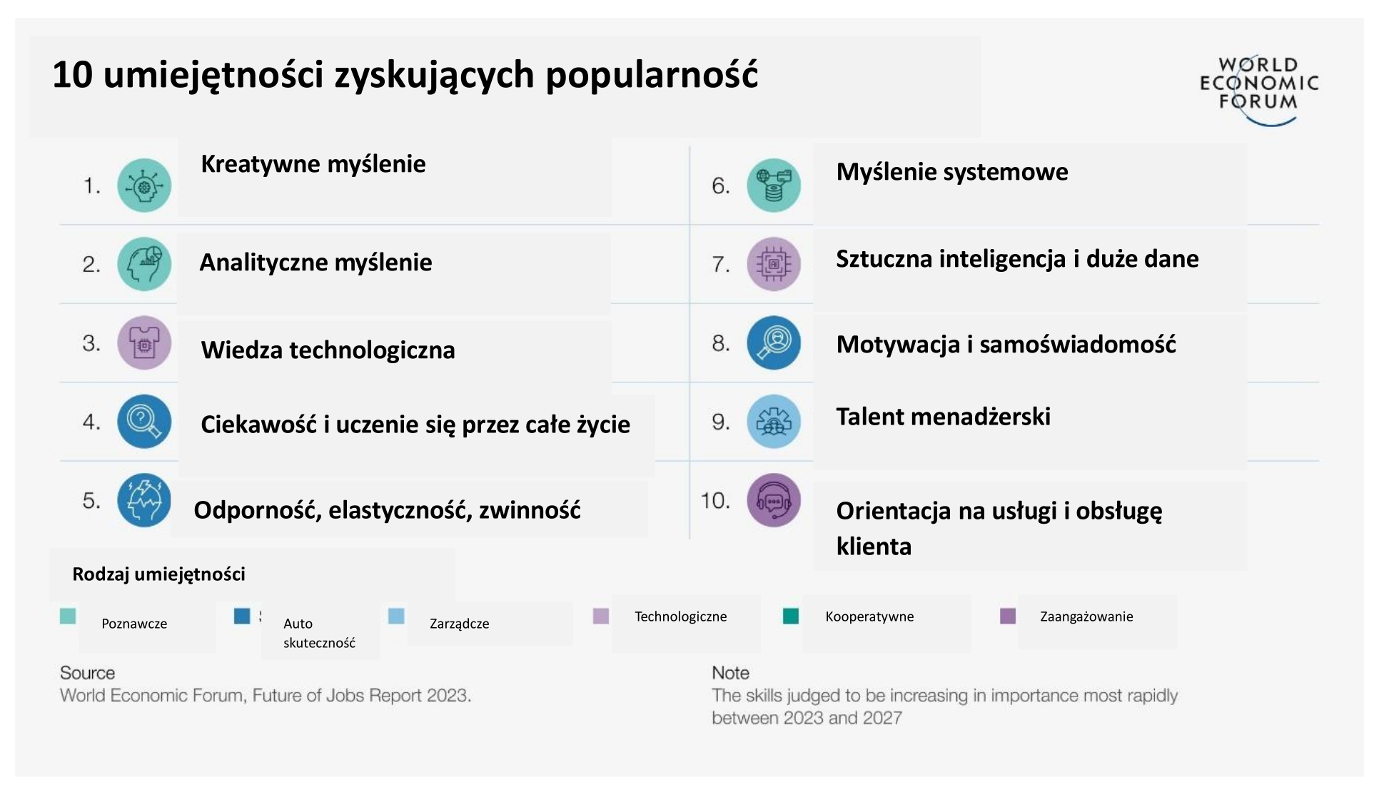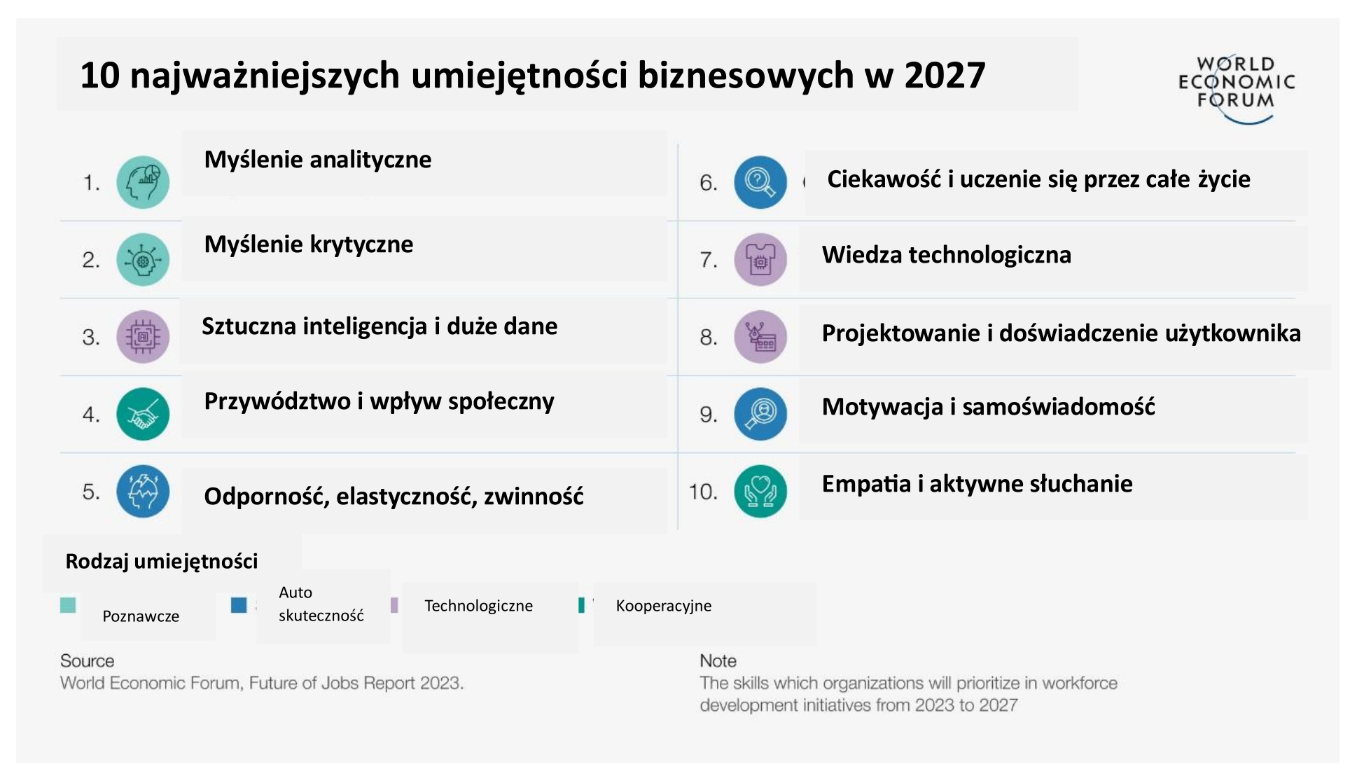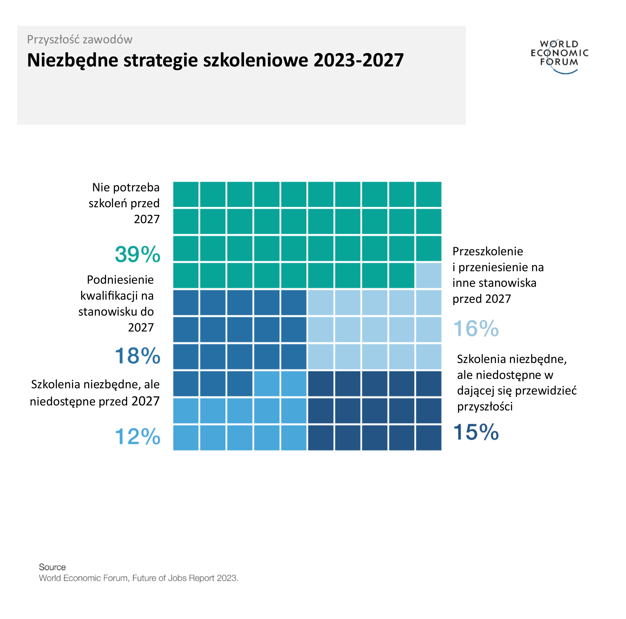 W 2023 r. przełomy technologiczne, a zwłaszcza rozwój generatywnej sztucznej inteligencji (AI) i zielona transformacja, krzyżują się z czynnikami gospodarczymi, geopolitycznymi, społecznymi i środowiskowymi, poszerzając zakres raportu. Edycja 2023 została oparta na badaniu 803 firm zatrudniających ponad 11,3 mln pracowników, obejmując 27 klastrów branżowych i 45 gospodarek z całego świata.